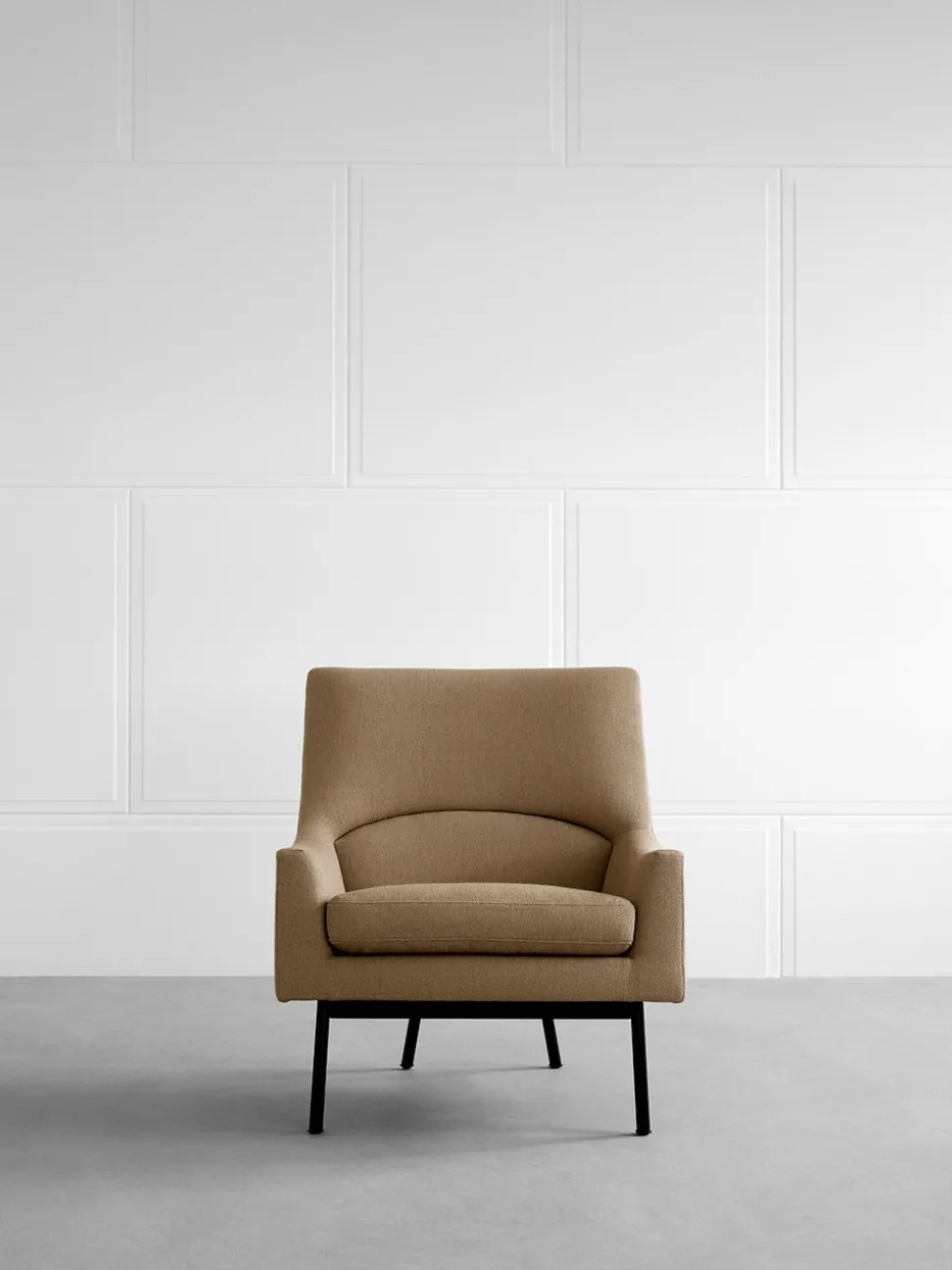 - Gestell aus schwarz lackiertem Stahl. Sitz mit blindem Gestell aus Holz, gepolstert mit HR- oder CMHR-Schaum und bezogen mit dem gewünschten Stoff. Passende abnehmbare Rücken- und Sitzkissen mit Schaumstoffkern und Daunenfedern.