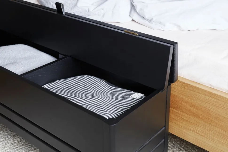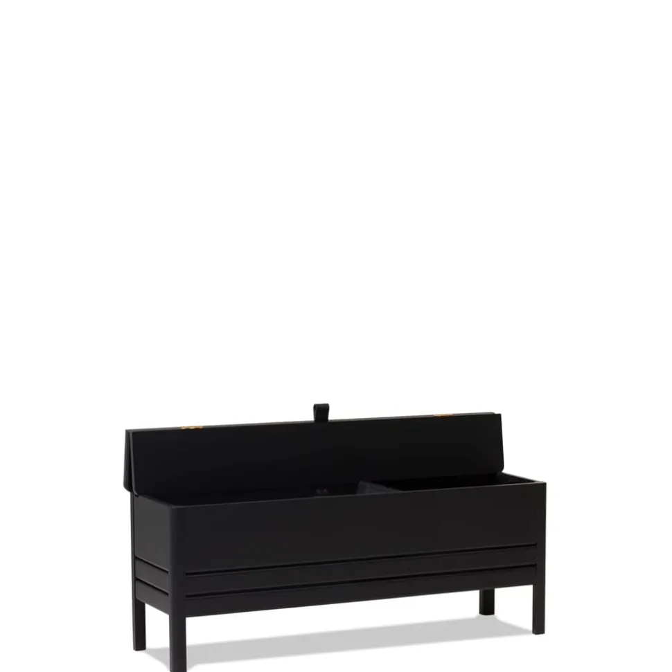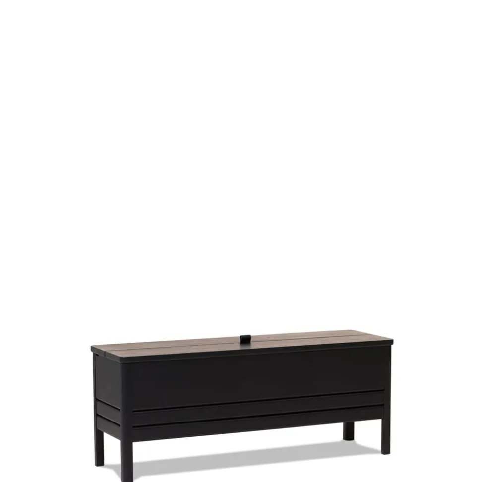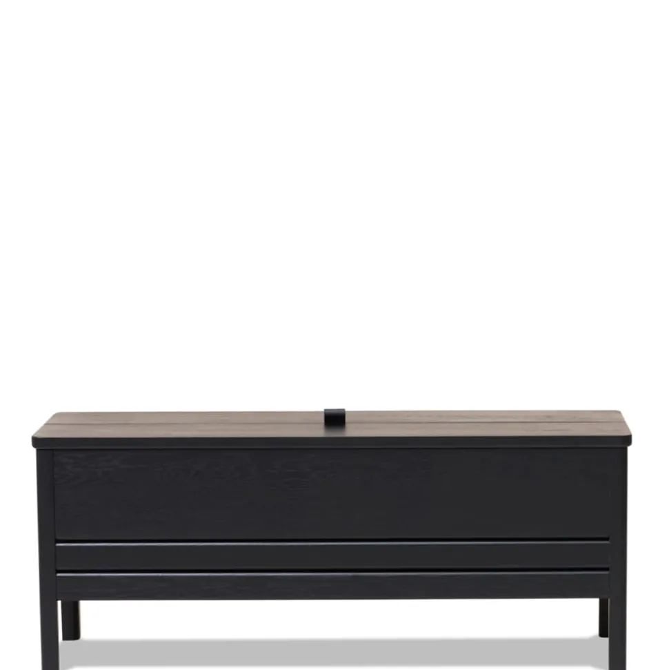 Eine aktualisierte Version der klassischen Entsorgungsbank, bei der Funktionalität auf reine Form trifft. Eine solide und vielseitige Bank mit leichteren, leicht reduzierten Abmessungen und minimalistischer Einstellung. Sie ist praktisch mit einer großen Ablagefläche – bestehend aus zwei separaten Fächern. Der Deckel wird über einen kleinen Ledergriff angehoben, und die Konstruktion hält den Deckel während der Benutzung fest in Position. Der untere Schnitt an den beiden Beinen und den Winkeln gibt ihr das Gefühl, angehoben zu werden, während die Gesamtkonstruktion solide und robust ist. Eine vielseitige Bank, entweder als Einzelstück im Flur, im Schlafzimmer oder in jedem Sitzbereich. Geliefert in Eiche und schwarz gebeizter Eiche.