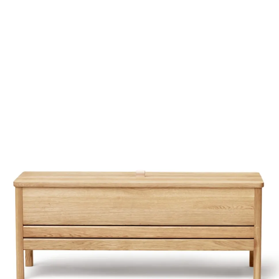 Eine aktualisierte Version der klassischen Entsorgungsbank, bei der Funktionalität auf reine Form trifft. Eine solide und vielseitige Bank mit leichteren, leicht reduzierten Abmessungen und minimalistischer Einstellung. Sie ist praktisch mit einer großen Ablagefläche – bestehend aus zwei separaten Fächern. Der Deckel wird über einen kleinen Ledergriff angehoben, und die Konstruktion hält den Deckel während der Benutzung fest in Position. Der untere Schnitt an den beiden Beinen und den Winkeln gibt ihr das Gefühl, angehoben zu werden, während die Gesamtkonstruktion solide und robust ist. Eine vielseitige Bank, entweder als Einzelstück im Flur, im Schlafzimmer oder in jedem Sitzbereich. Geliefert in Eiche und schwarz gebeizter Eiche.