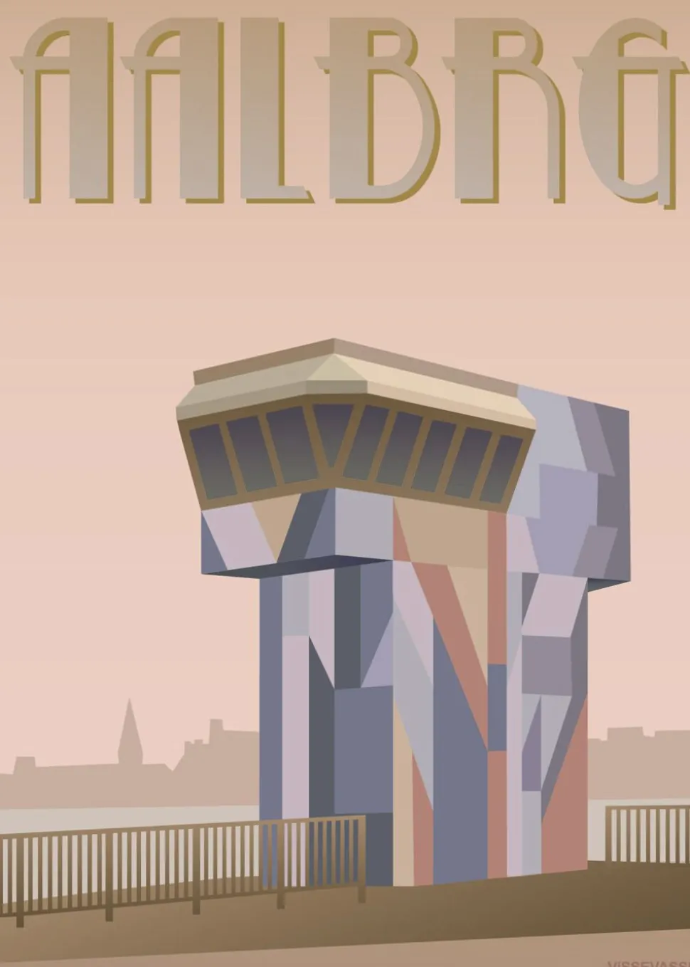 Dies ist ein Poster des bekannten „limfjordsbroen“ in Aalborg. Die Brücke dauerte drei Jahre und die Arbeit von 150 Arbeitern, bis die Brücke für den Test bereit war. Der Test wurde von 48 voll beladenen LKWs durchgeführt. Die Brücke überquert das Wasser des Limfjords und verbindet die größte Stadt Nordjütlands, Aalborg, mit dem benachbarten Nørresundby.
