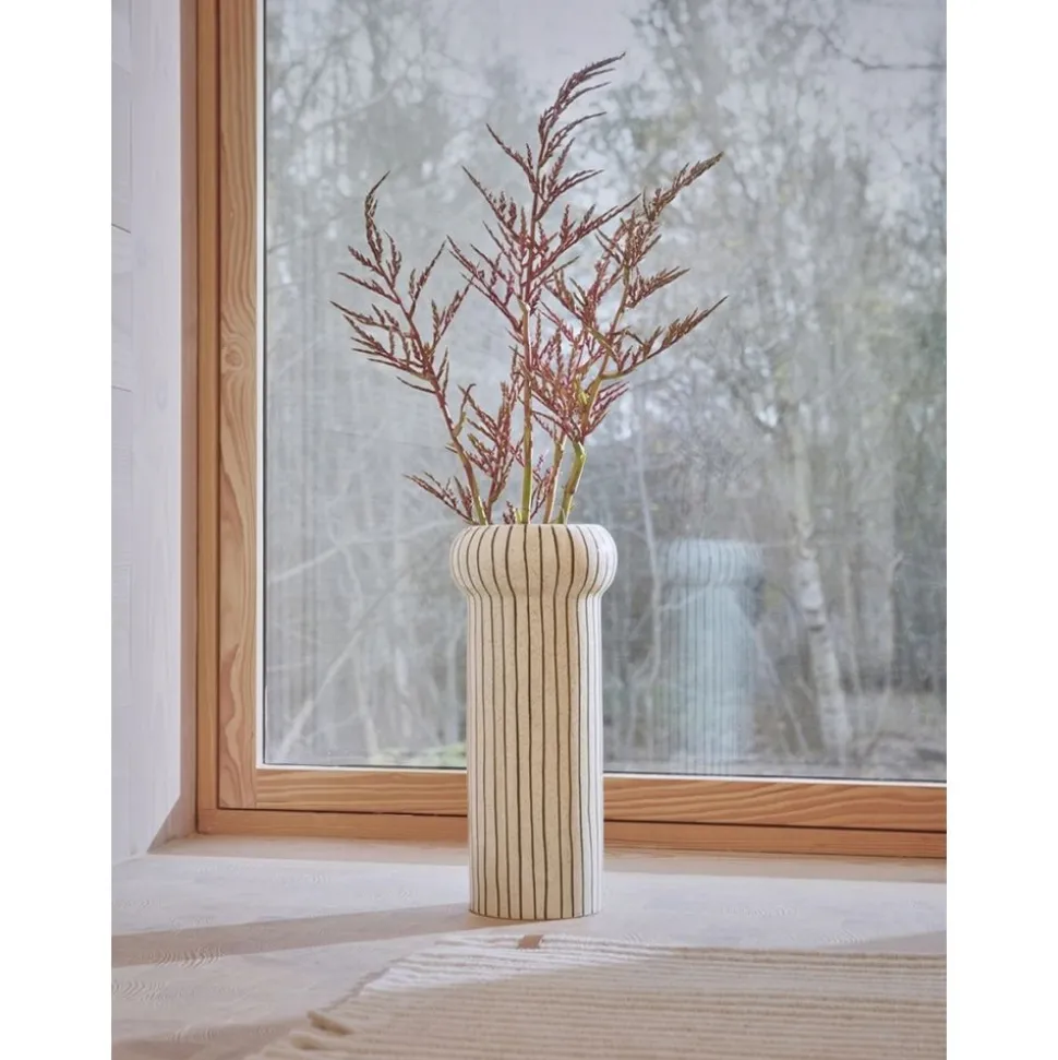 Einzigartige Bodenvase in schönem Streifendesign. Die Vase Aki ist handbemalt und aus Steingut hergestellt. Stellen Sie Ihre Lieblingsblumen in die Vase und gestalten Sie Ihre eigene Lieblingsdekoration.