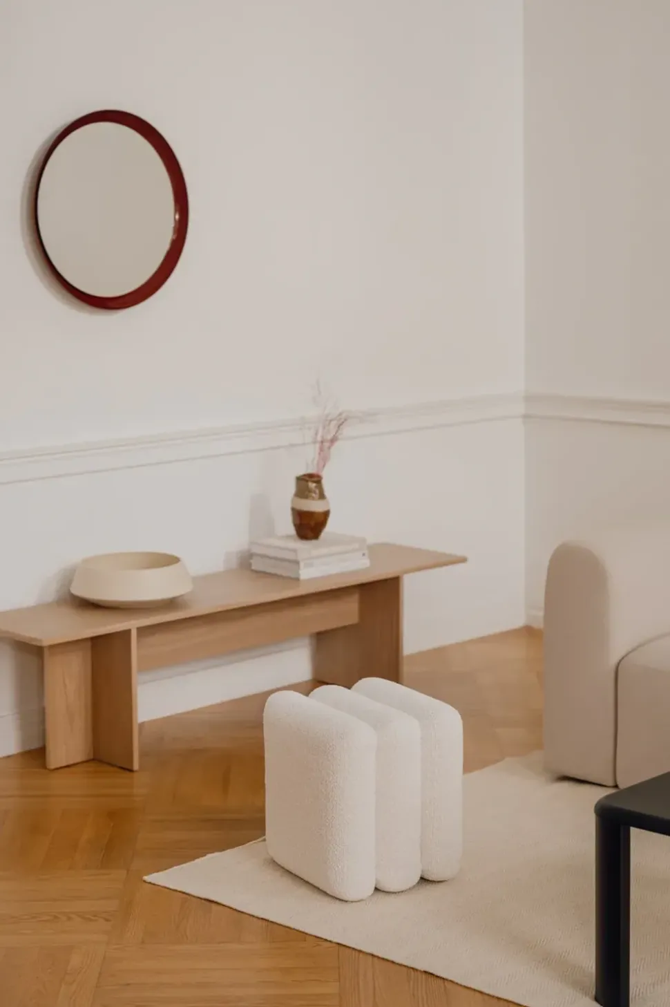 Er eignet sich perfekt für den Flur, das Bad oder das Wohnzimmer und dient sowohl als praktischer Spiegel als auch als stilvolles Dekorationselement. Lassen Sie ihn als subtiles Statement für sich stehen oder kombinieren Sie ihn mit natürlichen Texturen und sanften Farben für eine harmonische Atmosphäre.