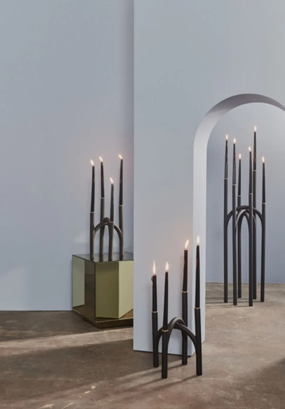 Das neueste Mitglied der ANGUI-Familie interpretiert die klassischen Traditionen der Kerzenhalter neu. Mit seinem gestaffelten und skulpturalen Design trägt der Tisch- und Bodenkerzenhalter ANGUI mühelos Kerzen und verleiht jedem Raum neue und majestätische Dimensionen. Aufgrund seines asymmetrischen Designs werfen die Kerzen auf verschiedenen Ebenen faszinierende Schatten.