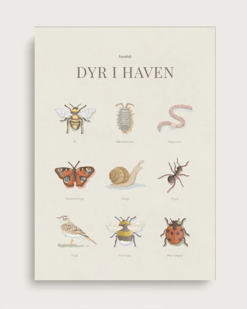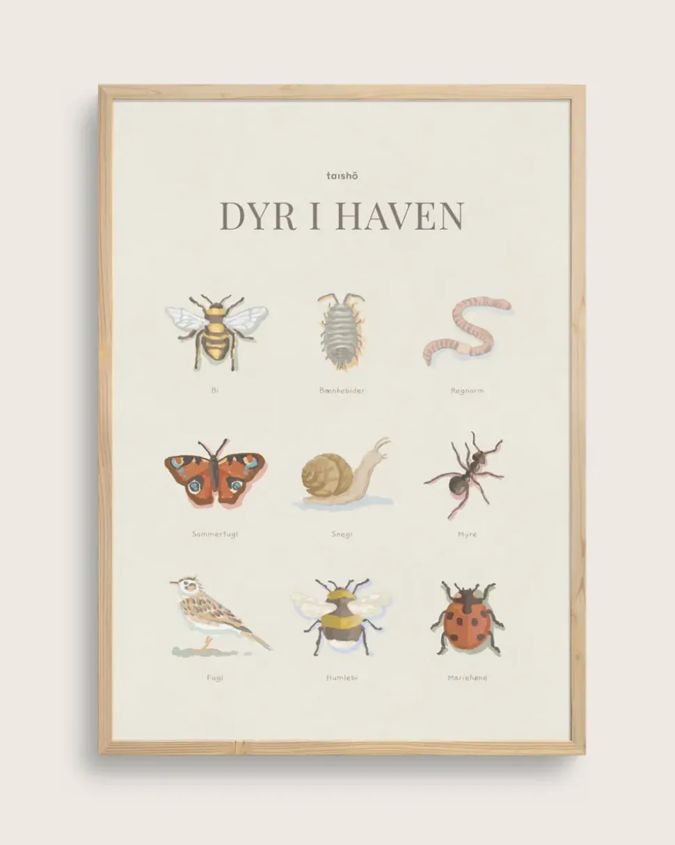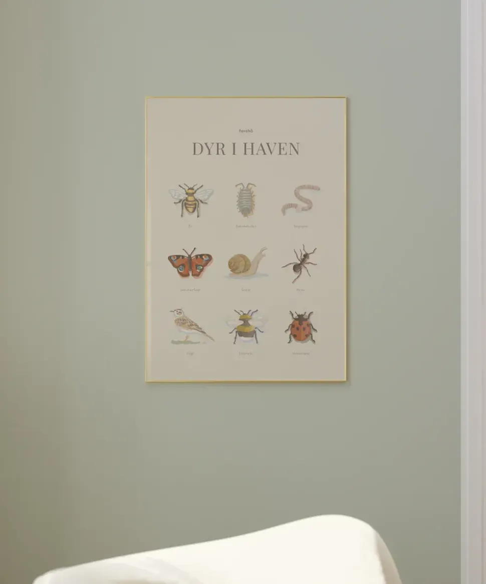 Tiere im Garten“ von , ist ein niedliches Kinderposter mit Gartentieren. Auf dem Poster finden Sie kleine Abbildungen von sechs verschiedenen Tieren, die in den dänischen Gärten zu finden sind. Die Bilder regen zum Dialog, zum Spielen und zum Lernen an.