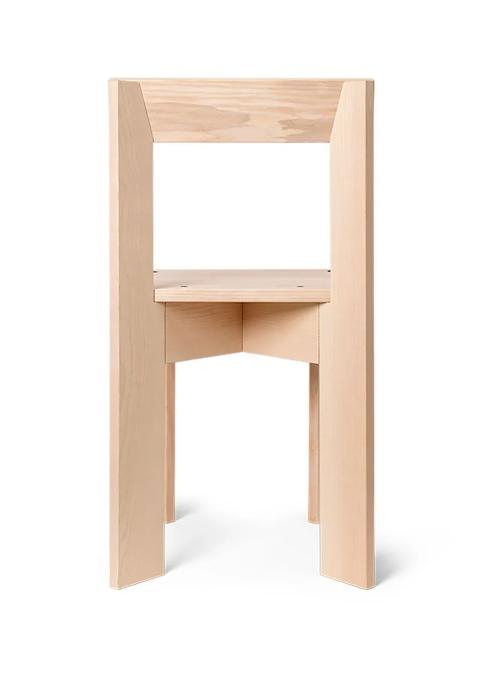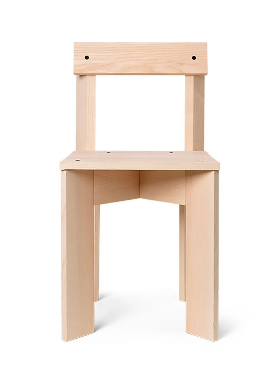 Der Esszimmerstuhl ist Teil der Kollektion Ark. Diese Kollektion arbeitet mit den Standardmaßen von Massivholzdielen und setzt mit ihrer ehrlichen, kompromisslosen und lesbaren Designästhetik ein Zeichen in der Wohnung. Die Stühle bestehen zu 100 % aus FSC™-zertifiziertem Holz, das leicht zerlegt werden kann, um seinen ökologischen Fußabdruck zu verringern.