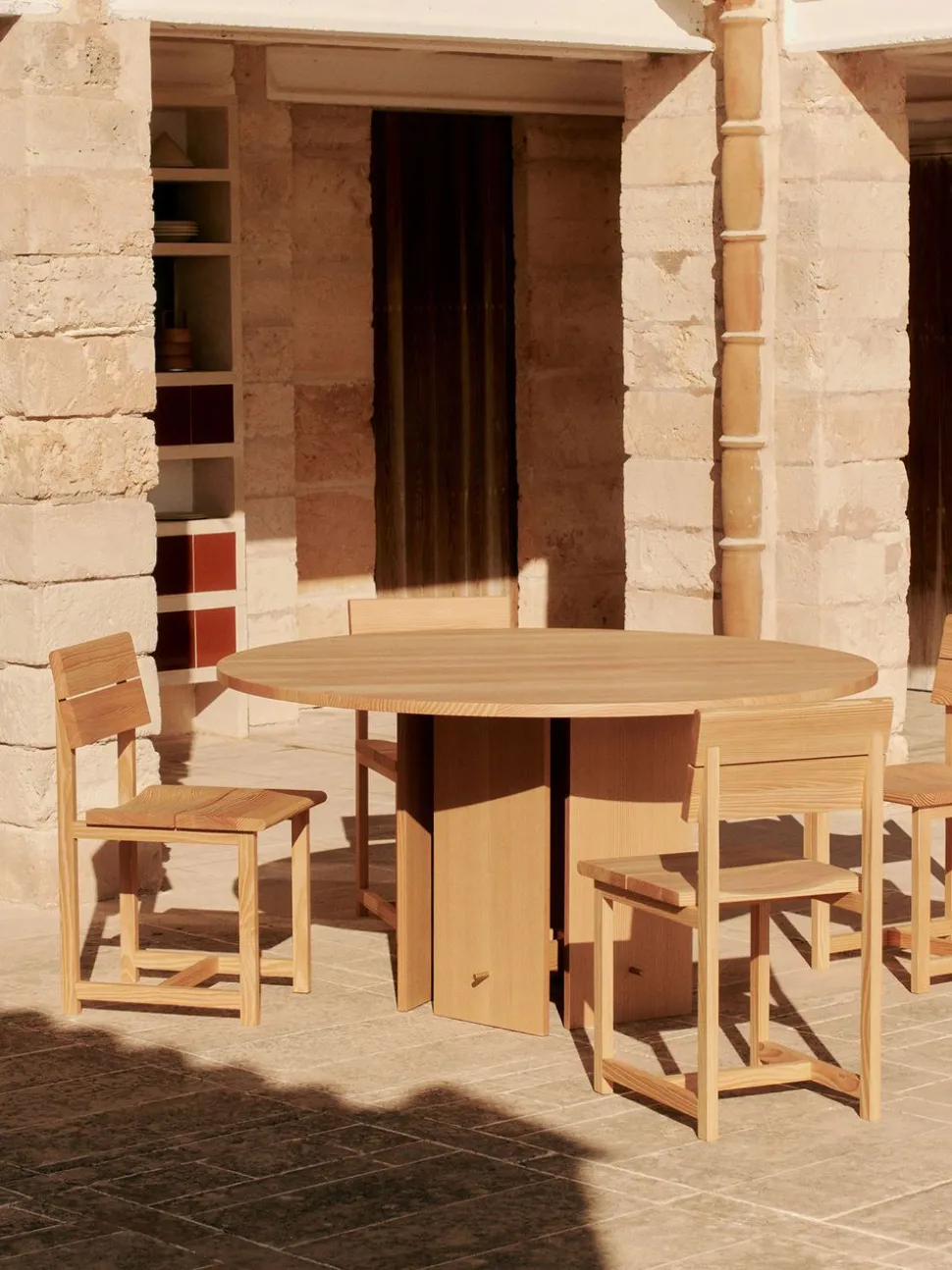 Der Aukko Esstisch von ist eine Hommage an die architektonische Vision von Jørn Utzon, inspiriert von seiner ikonischen Privatresidenz Can Lis auf Mallorca. Der aus FSC®-zertifizierter Douglasie gefertigte Tisch verbindet skulpturale Eleganz mit funktionalem Design. Die runde Tischplatte ruht auf einem kunstvoll konstruierten Unterbau aus vertikalen Holzlatten, die ihm eine dynamische Tiefe verleihen. Sein monolithischer Ausdruck vereint Minimalismus mit einer sinnlichen Wärme und macht ihn zu einem natürlichen Mittelpunkt in jedem Raum.