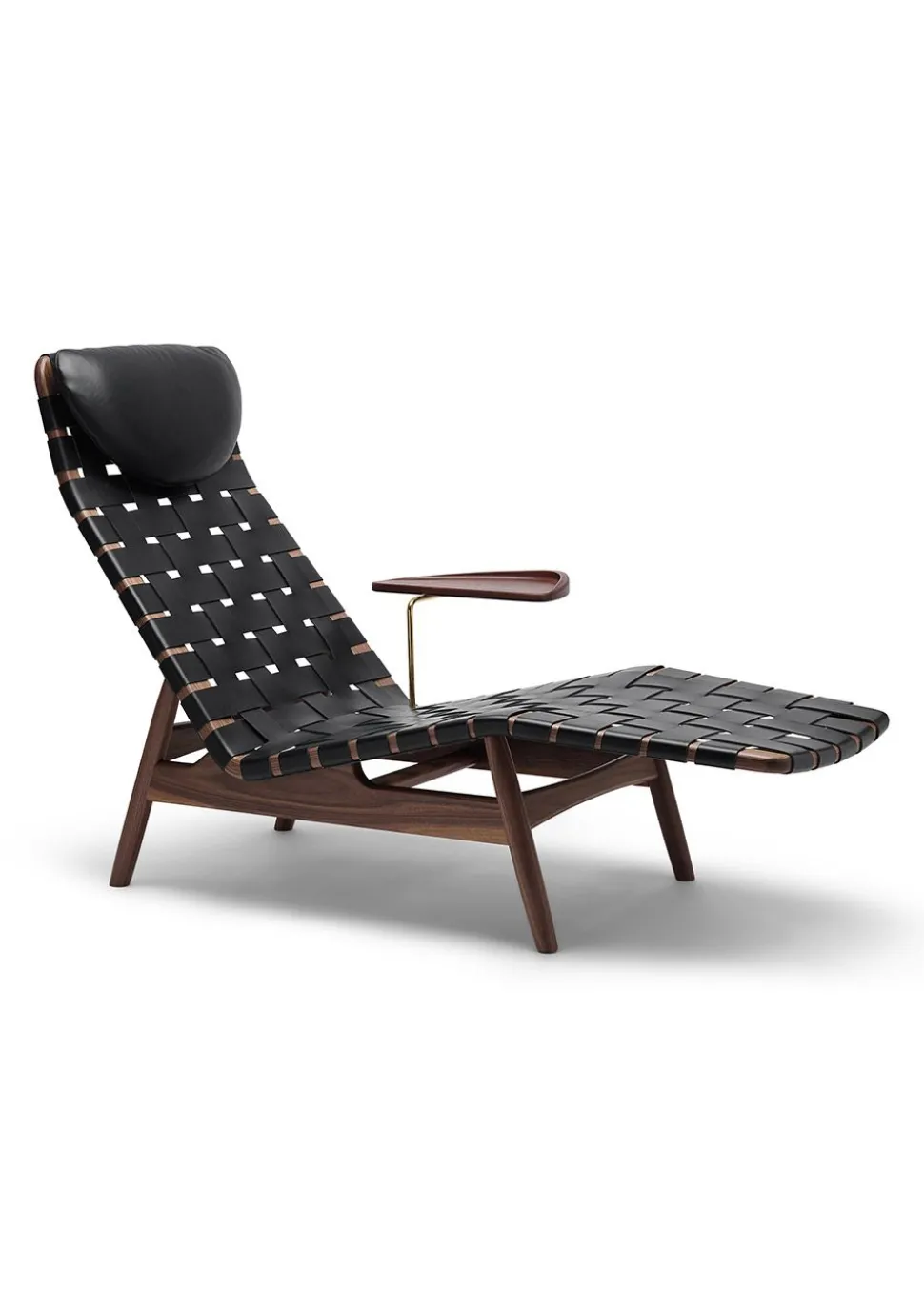 - Material: Gestell aus FSC-zertifizierter Eiche oder Nussbaum mit Gestell und Beistelltisch aus Eichenfurnier oder Nussbaumfurnier. Sitz aus gewebtem Vollnarbenleder mit passender Kopfstütze.