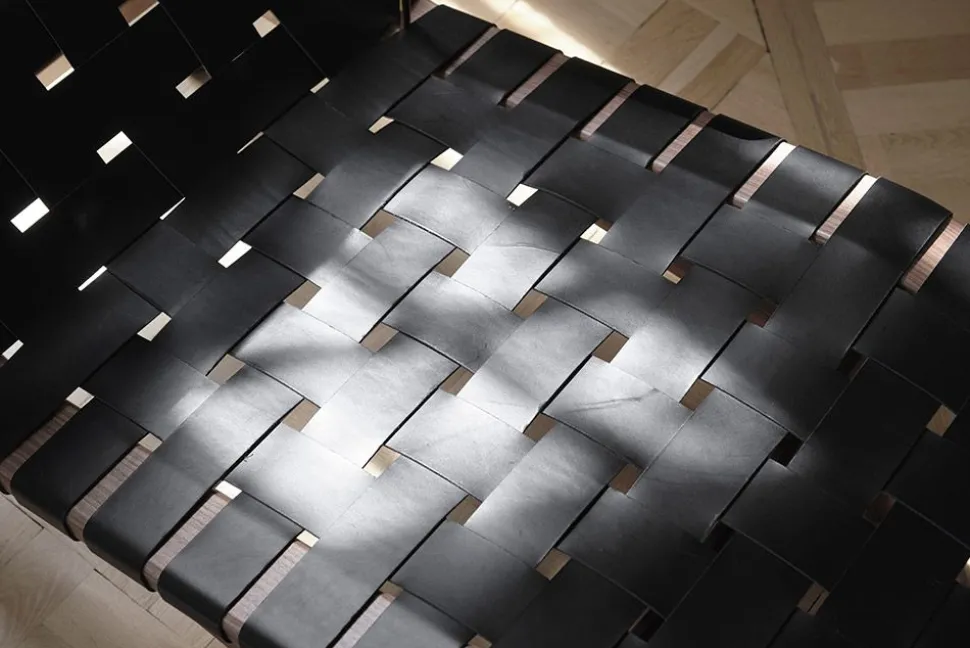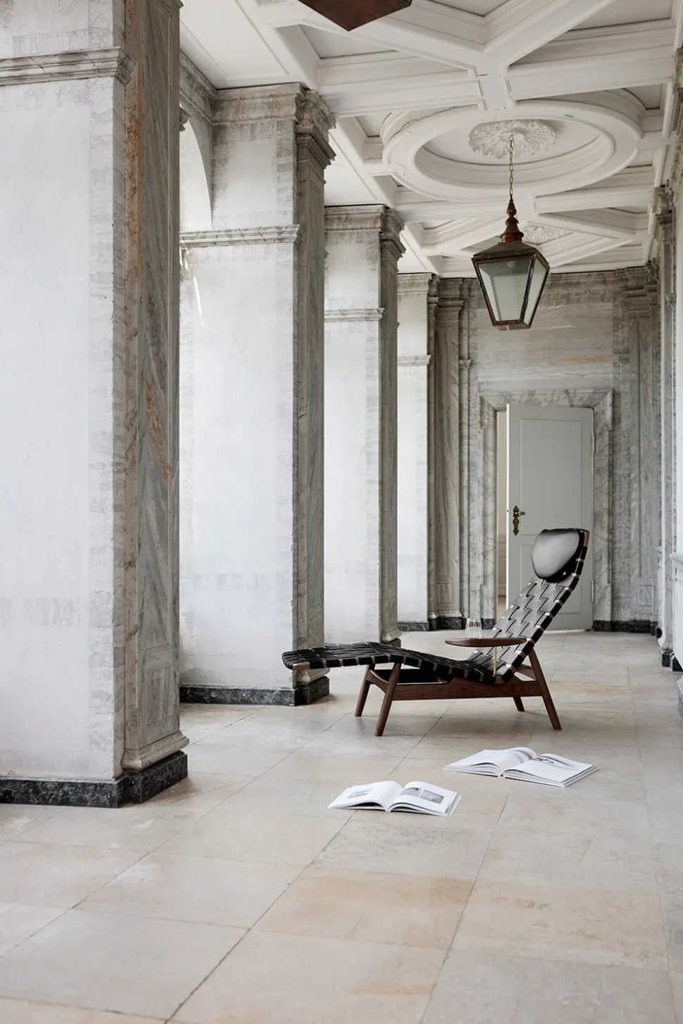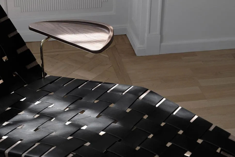 Die von der dänischen Architektenikone entworfeneAV Egoist Chaise Lounge ist ein Musterbeispiel für Vodders Fähigkeit, zeitlose und dennoch extravagante Möbel zu entwerfen. Das Gestell ist klassisch und elegant in schönem dunklem Holz gehalten, aber der Star des Möbelstücks ist die Sitzfläche – breite Lederbänder, die elegant geflochten sind, um einen bequemen Sitz zu schaffen, der sich dem Körper anpasst. Obwohl es sich um eine klassische Materialkombination handelt, schafft es Vodder mit seinen Techniken, das Stück wirklich einzigartig zu machen. Der integrierte Beistelltisch fungiert als natürliche Erweiterung der Natur des Möbels, bei dem die Entspannung und alles, was dazu gehört, im Mittelpunkt steht.