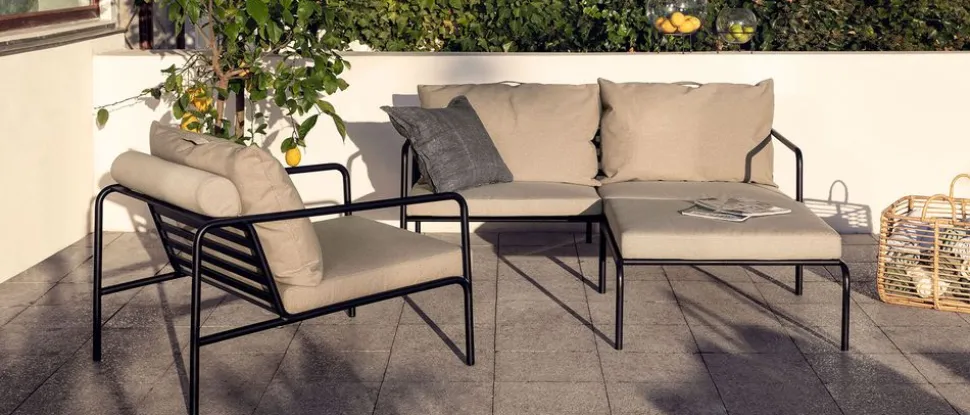 Der AVON Ottoman von , entworfen von Henrik Pedersen, ist eine Hommage an die skandinavische Designtradition und zeitgenössische Ästhetik. Dieses Gartensofa vereint Eleganz und Funktionalität in einem harmonischen Materialmix: ein Gestell aus pulverbeschichtetem Stahl und Kissen aus OEKO-TEX-zertifiziertem Acryl- und Polyestergemisch für Langlebigkeit und Komfort. Der Stoff, der aufgrund seiner wasser- und schmutzabweisenden Eigenschaften ausgewählt wurde, ist ideal für den Einsatz im Freien. Mit seinem leichten Aussehen und dem niedrigen, schlanken Profil erfüllt der AVON Ottoman den Wunsch nach einem Möbelstück, das optische Leichtigkeit mit hohem Komfort verbindet. Die großen, weichen Rückenkissen und das wartungsfreie Gestell sind das Herzstück dieses Entwurfs, dessen niedrige Linienführung dafür sorgt, dass das Möbelstück mit oder ohne Kissen, im Sommer oder im Winter immer eine gute Figur macht.
