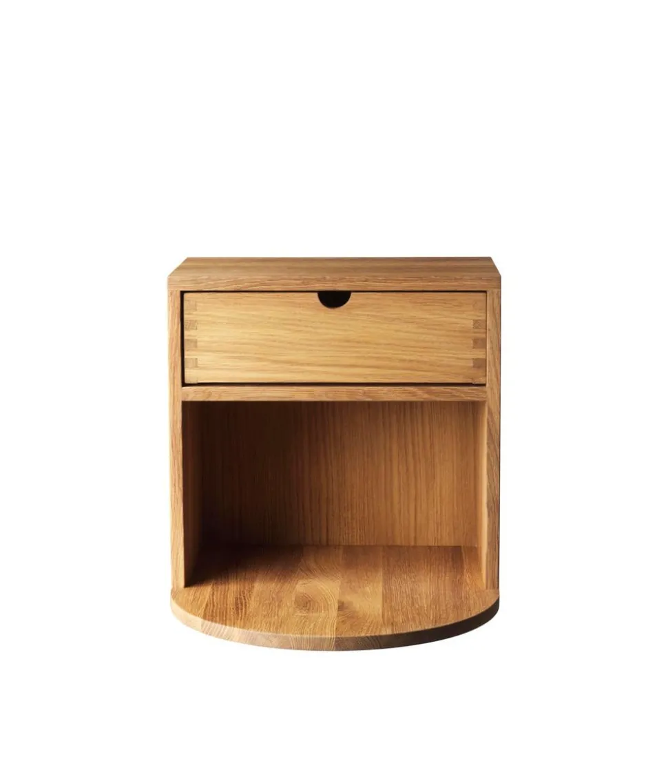 Der Hängeschrank hängt an der Wand und verleiht dem Raum durch die matt lackierte Eiche ein weiches und organisches Gefühl. Das Möbel ist multifunktional, so dass es als Wandschrank, Eingangsmöbel oder Nachttisch verwendet werden kann.