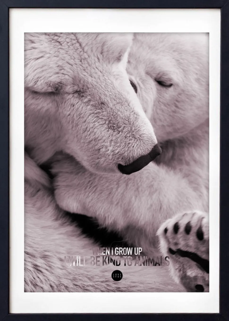 So schönes und süßes Poster mit Eisbären der dänischen Marke Love A Fox. Das Poster besteht aus 200 Gramm Altpapier in hoher Qualität und wird in Dänemark hergestellt. Das perfekte Poster für den Kindergarten oder das Spielzimmer für die Kinder. Auf dem Poster steht „Wenn ich erwachsen bin, werde ich nett zu Tieren sein“.