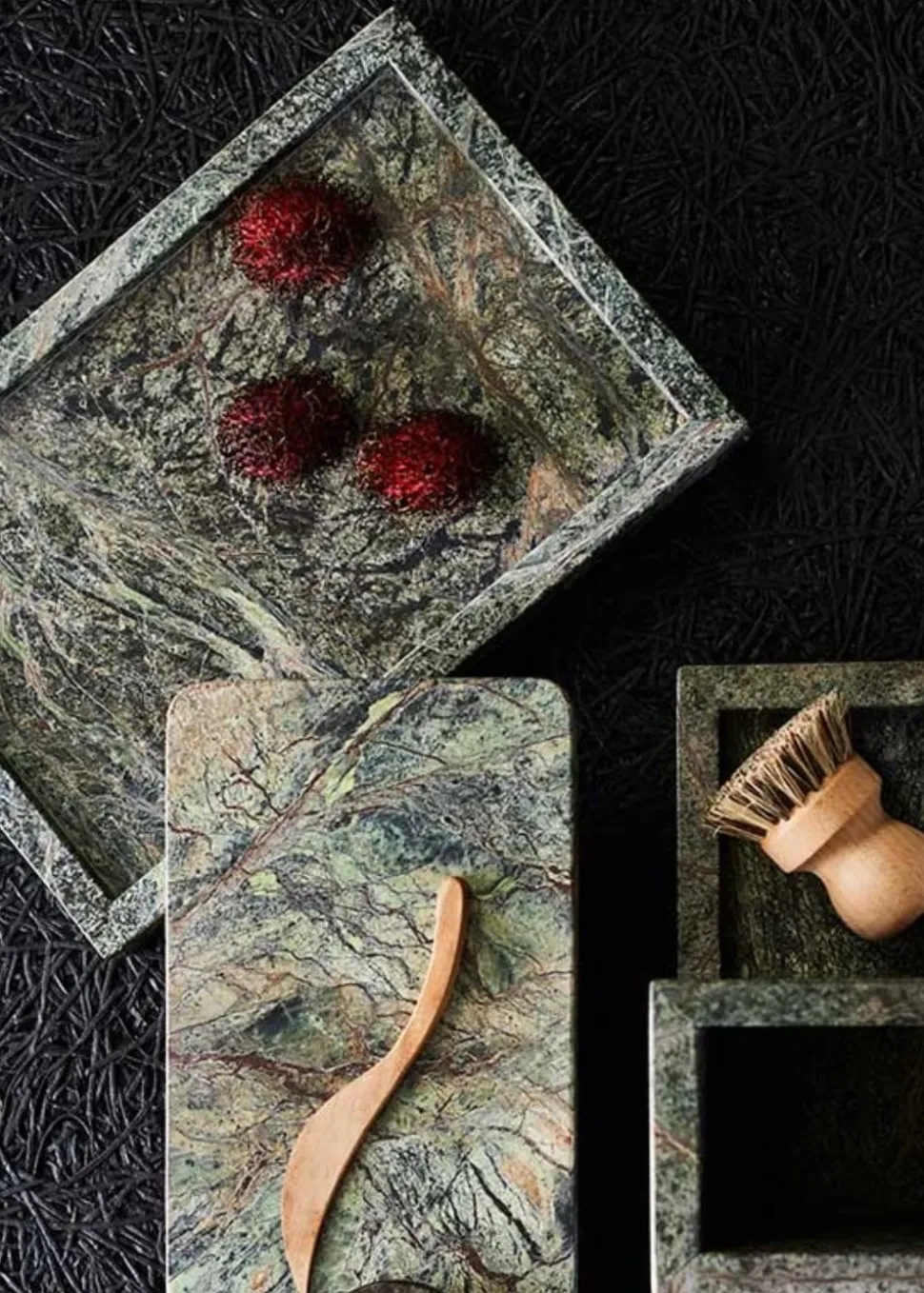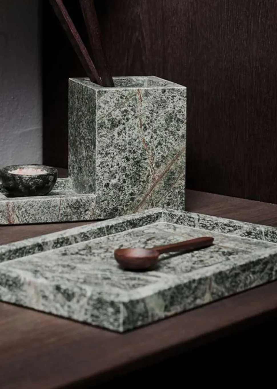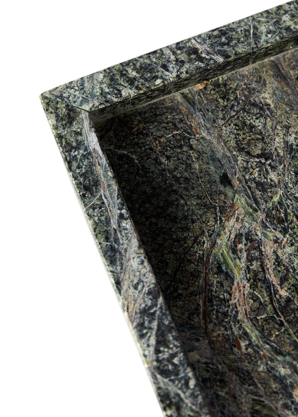 Das Tablett Vita von Muubs ist nicht nur ein Serviertablett, sondern ein wahres Meisterwerk der Handwerkskunst, das Funktionalität und natürliche Schönheit vereint. Aus feinstem grünen Marmor gefertigt, fängt dieses exklusive Tablett die mühelose Ästhetik der Natur ein und bringt ein Gefühl von Luxus und Raffinesse in jeden Raum. Jedes Vita-Tablett ist ein Unikat mit einer eigenen, unverwechselbaren Marmorierung und Farbgestaltung, die Ihrer Inneneinrichtung eine persönliche und künstlerische Note verleiht. Die robuste Konstruktion und die edlen Materialien sorgen dafür, dass dieses Tablett nicht nur eine Augenweide ist, sondern auch eine dauerhafte Bereicherung für Ihr Zuhause.