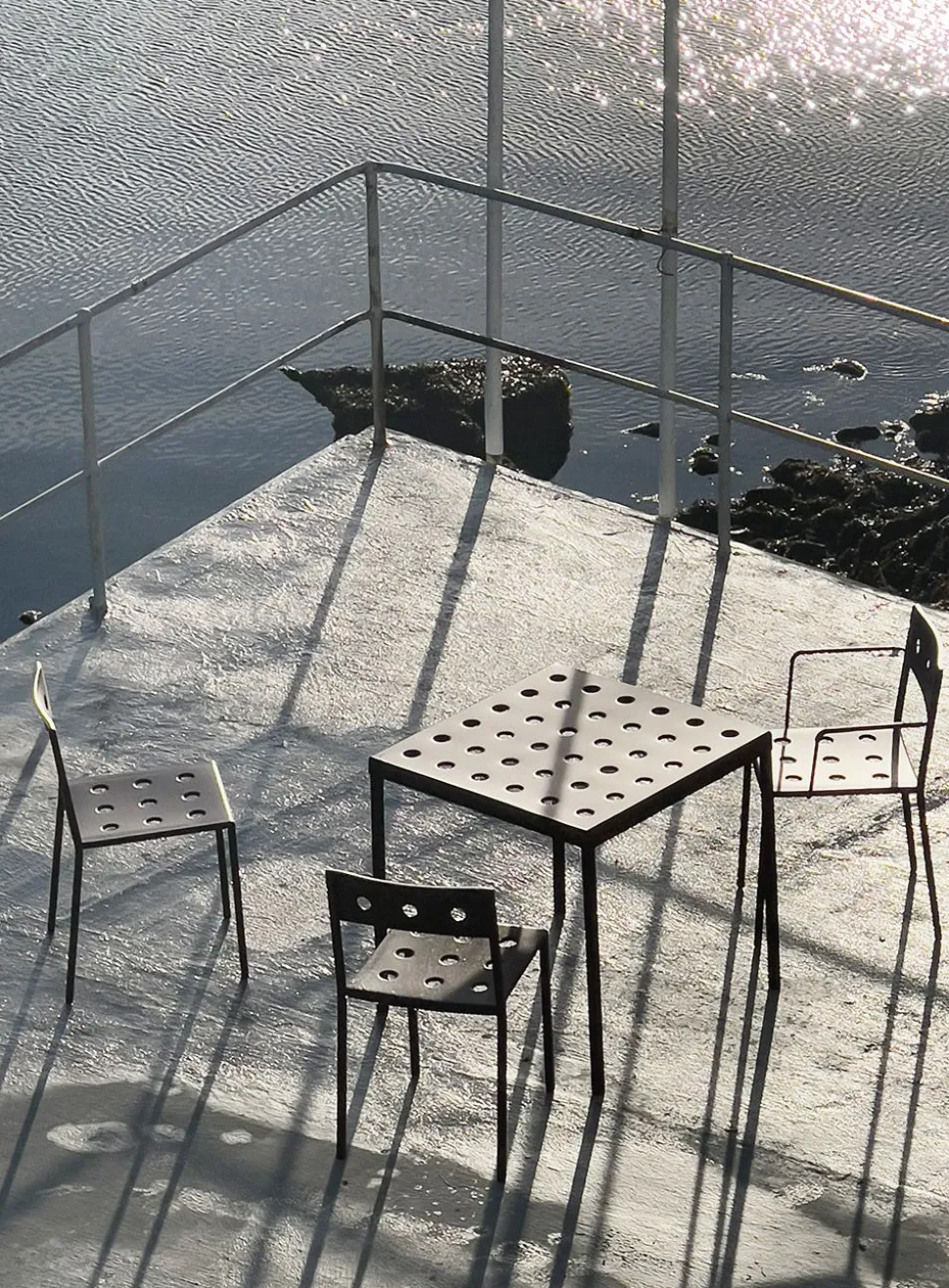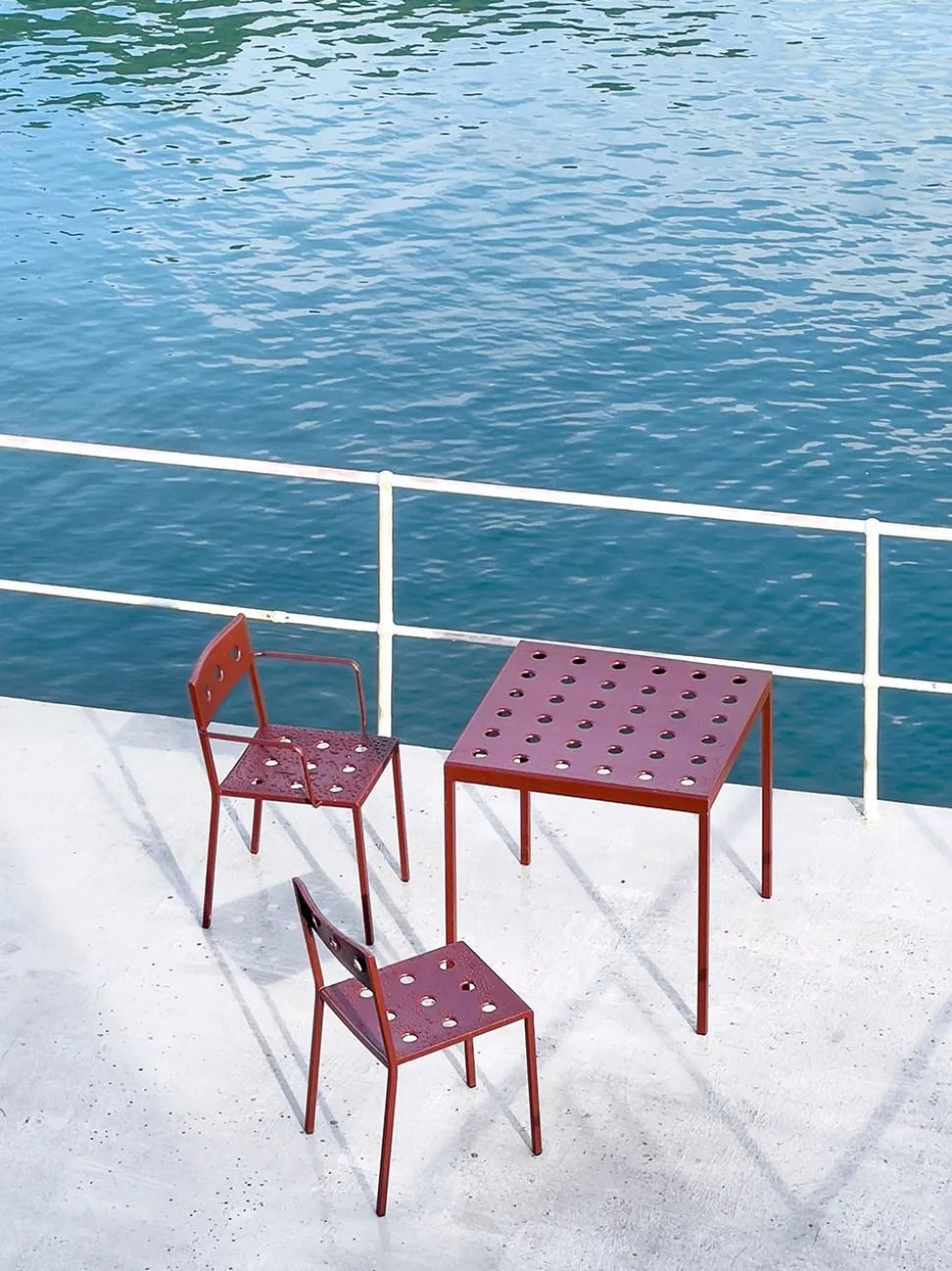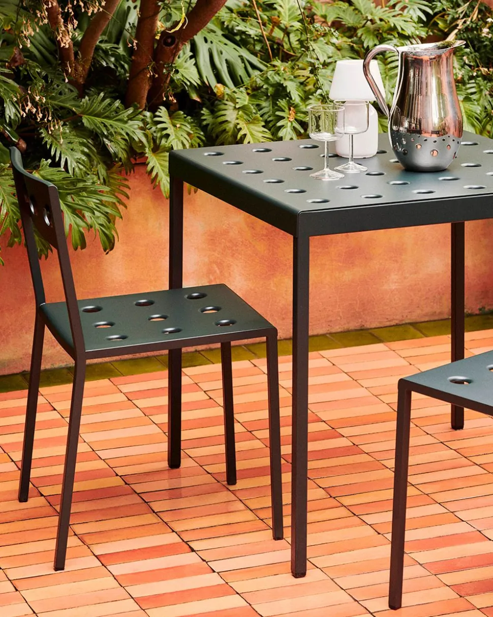 Balcony Table | Small ist ein schlichter, quadratischer Esstisch, der die verschiedenen Esszimmerstühle der Serie ergänzt. Dank der schmalen Beine passt der Tisch auch in die engsten Räume, und die markante perforierte Tischplatte sorgt dafür, dass sich kein Wasser auf der Tischplatte ansammelt.