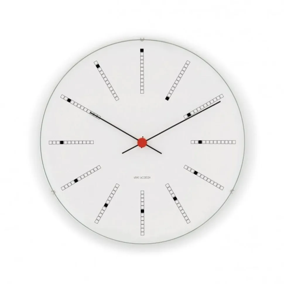 gewinnt 1961 den Wettbewerb für die Dänische Nationalbank, und das Gebäude wird 1978, sieben Jahre nach seinem Tod, fertig gestellt. Banker’s Clock befindet sich in der Veranda und führt als Kathedrale fast 20 Meter hoch durch alle sechs Stockwerke des Gebäudes. Die Wände sind mit Marmor verkleidet, und etwas Tageslicht strömt durch schmale vertikale Fensterschlitze. Die Serie ist sowohl als Wanduhr als auch als Tischuhr erhältlich. Die Wanduhr ist in vier verschiedenen Größen erhältlich und wird mit ihrem klassischen und zeitlosen Design in jedem Raum bequem sein.