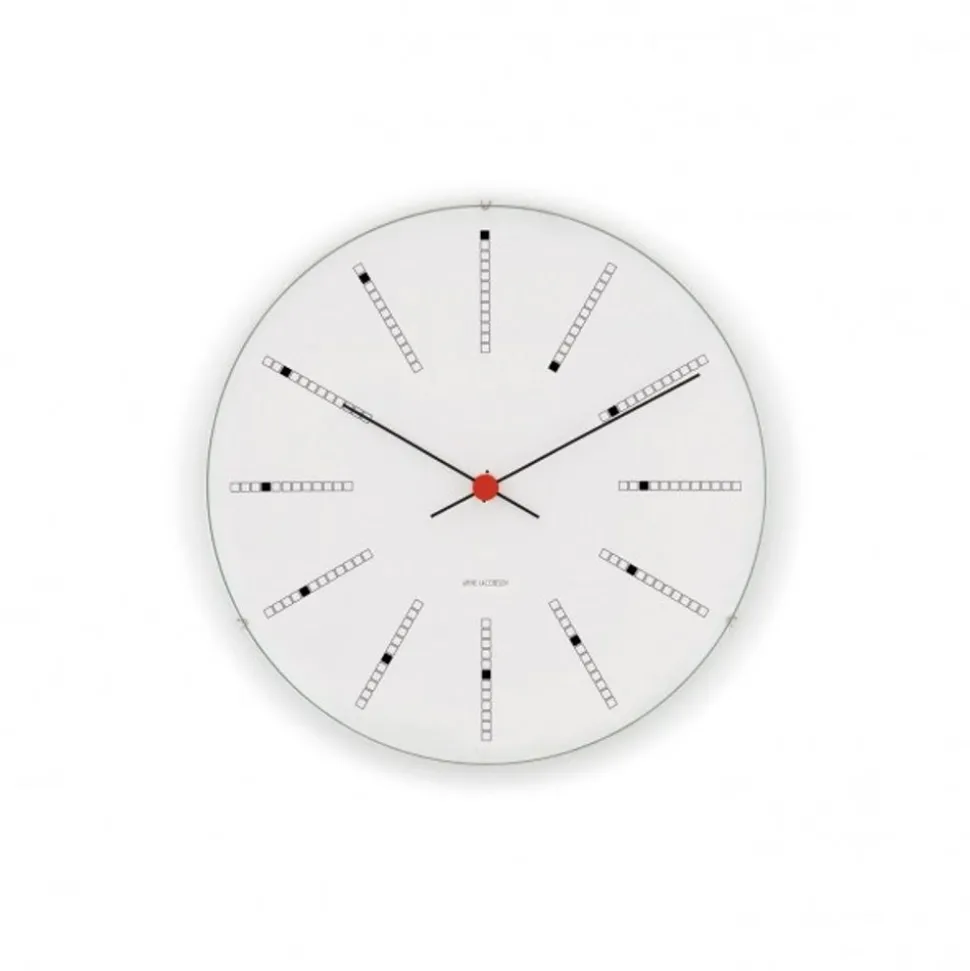 gewinnt 1961 den Wettbewerb für die Dänische Nationalbank, und das Gebäude wird 1978, sieben Jahre nach seinem Tod, fertig gestellt. Banker’s Clock befindet sich in der Veranda und führt als Kathedrale fast 20 Meter hoch durch alle sechs Stockwerke des Gebäudes. Die Wände sind mit Marmor verkleidet, und etwas Tageslicht strömt durch schmale vertikale Fensterschlitze. Die Serie ist sowohl als Wanduhr als auch als Tischuhr erhältlich. Die Wanduhr ist in vier verschiedenen Größen erhältlich und wird mit ihrem klassischen und zeitlosen Design in jedem Raum bequem sein.