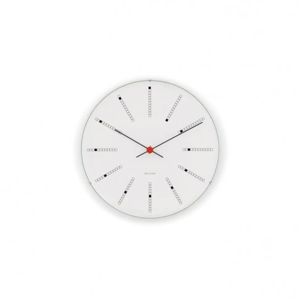 gewinnt 1961 den Wettbewerb für die Dänische Nationalbank, und das Gebäude wird 1978, sieben Jahre nach seinem Tod, fertig gestellt. Banker’s Clock befindet sich in der Veranda und führt als Kathedrale fast 20 Meter hoch durch alle sechs Stockwerke des Gebäudes. Die Wände sind mit Marmor verkleidet, und etwas Tageslicht strömt durch schmale vertikale Fensterschlitze. Die Serie ist sowohl als Wanduhr als auch als Tischuhr erhältlich. Die Wanduhr ist in vier verschiedenen Größen erhältlich und wird mit ihrem klassischen und zeitlosen Design in jedem Raum bequem sein.