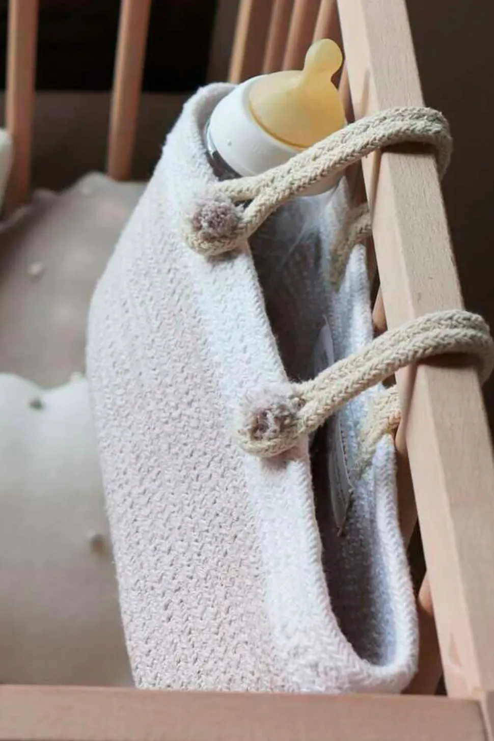 Der Korb eignet sich perfekt zum Aufhängen im Kinderzimmer, an der Wickelkommode oder am Kinderwagen. Der Korb besteht aus weicher Baumwolle und ist so konzipiert, dass die wichtigsten Dinge für das Baby immer griffbereit sind. Er ist in einem schönen Weiß gehalten, hat einen eleganten gestreiften Rand und ist mit süßen kleinen Bommeln verziert.