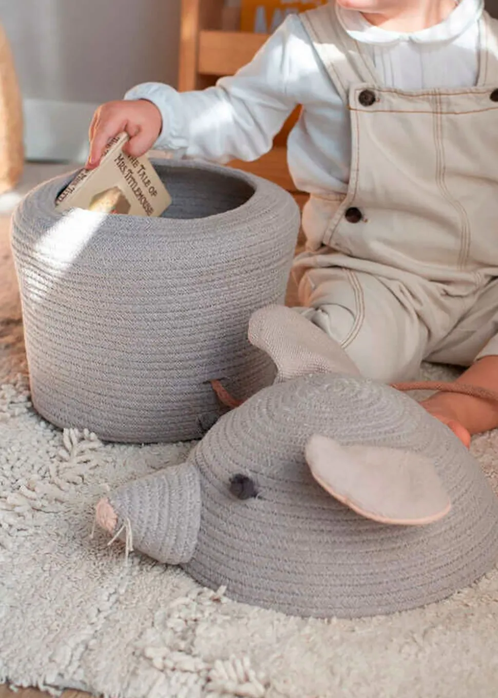 Der Korb Renata The Rat von ist ein neugieriger und charmanter Aufbewahrungskorb für Kinder mit geflochtenen Schnüren aus recycelten PET-Flaschen und Baumwollfarben. Der Korb ist Teil der Serie Animal Crew.