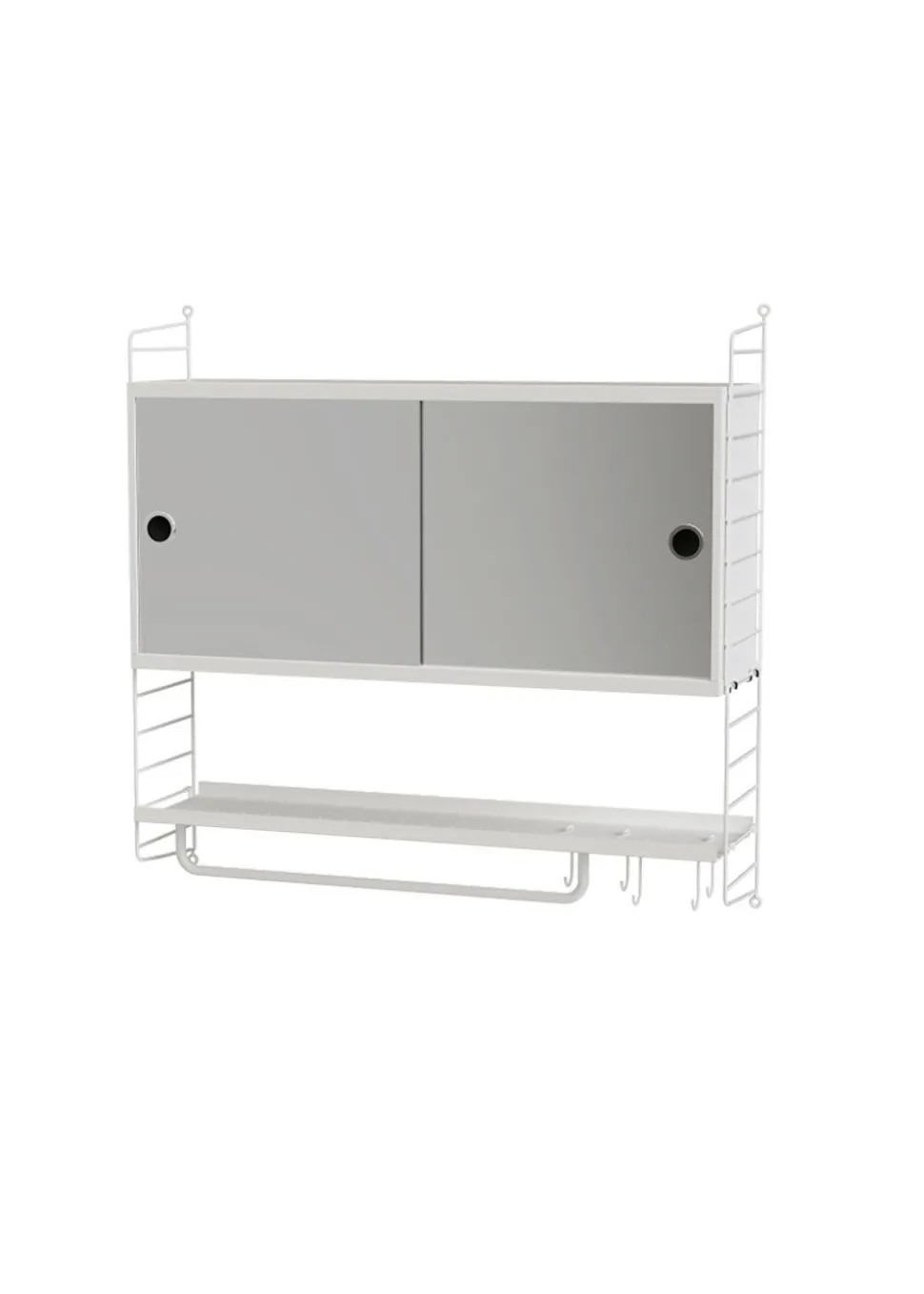 Bathroom A lädt zur kreativen Gestaltung Ihres Badezimmers ein. Das wandhängende Design schafft Bodenfreiheit und Großzügigkeit, während die integrierten Haken zusätzliche Funktionalität für Handtücher und Bademäntel bieten. Das System harmoniert mit einer Reihe von Einrichtungsstilen und kann mit anderen String Furniture-Stücken kombiniert werden, um einen zusammenhängenden und anspruchsvollen Raum zu schaffen.