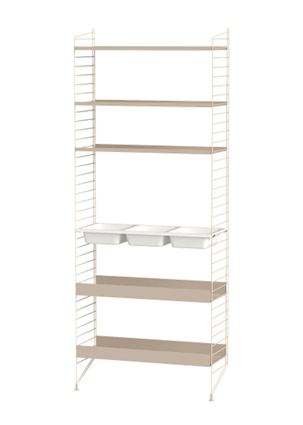 Dieses Regalsystem wurde von selbst entworfen und trägt die Handschrift der Marke: Funktionalität trifft auf Minimalismus. Es zelebriert die Handwerkskunst und die Qualität, die im Mittelpunkt der Designphilosophie von stehen, und garantiert ein Produkt, das sowohl im Stil als auch in der Anwendung überzeugt.
