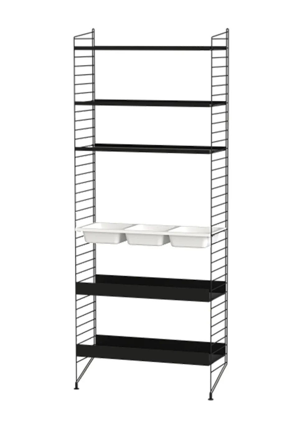 - Bestandteile: 1 x 2er-Pack Bodenplatte h200 x d30 cm | 2 x Metallregal hoch b78 x d30 cm | 3 x Metallregal niedrig b78 x d30 cm | 1 x Schalenregal b78 x d30 cm.