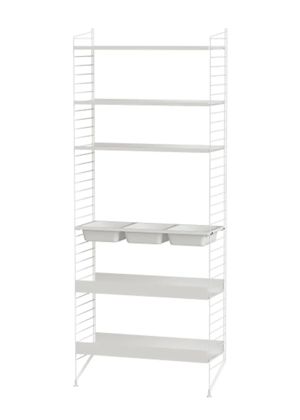 - Bestandteile: 1 x 2er-Pack Bodenplatte h200 x d30 cm | 2 x Metallregal hoch b78 x d30 cm | 3 x Metallregal niedrig b78 x d30 cm | 1 x Schalenregal b78 x d30 cm.