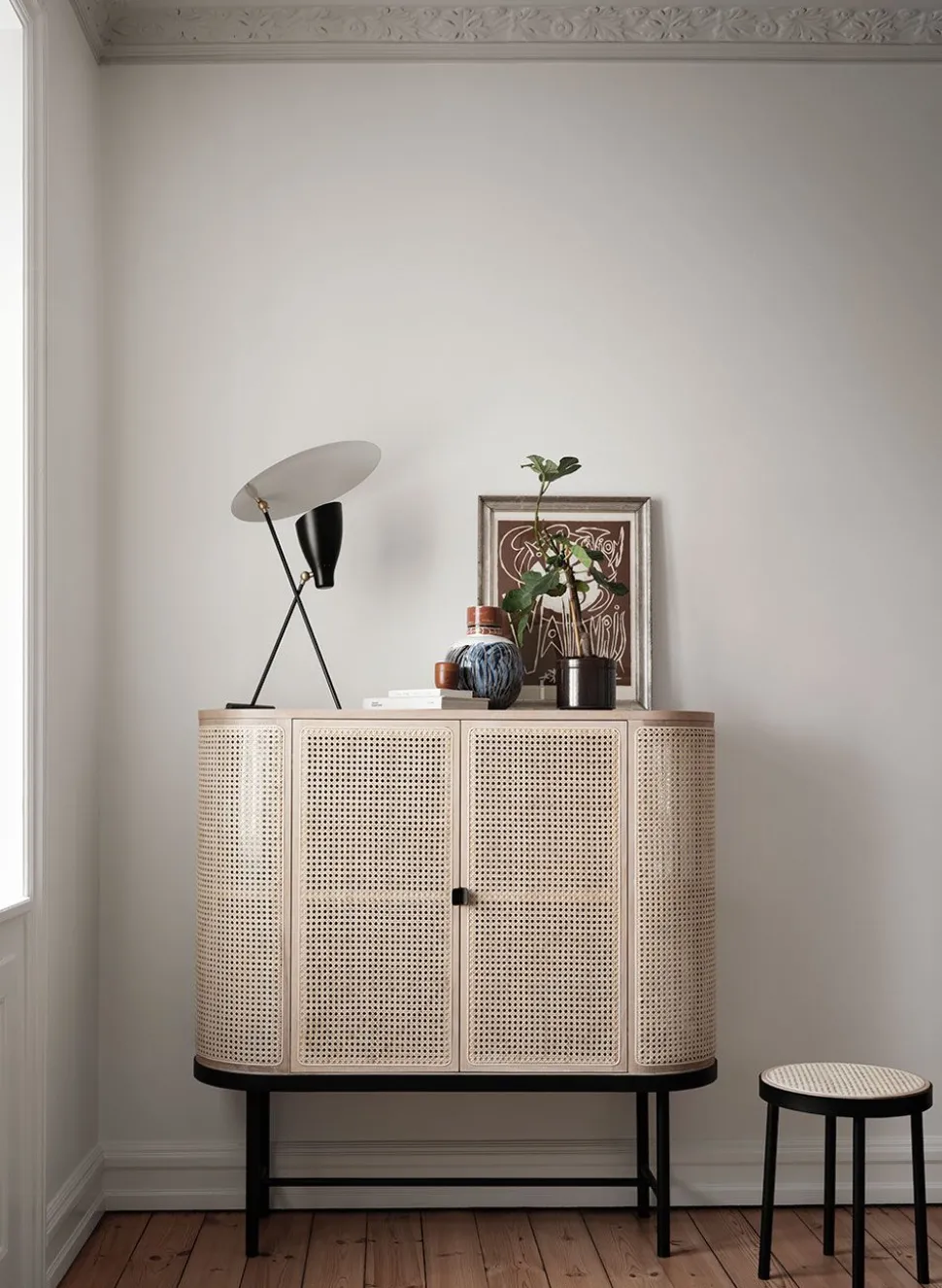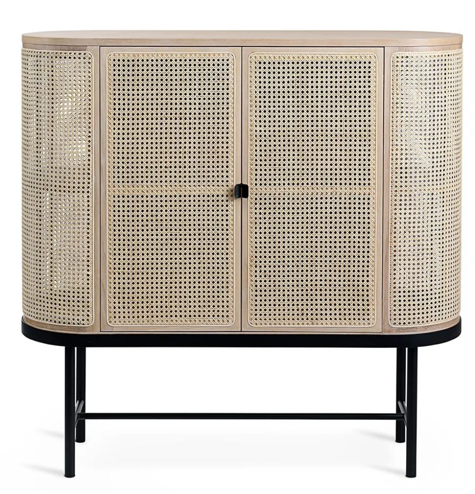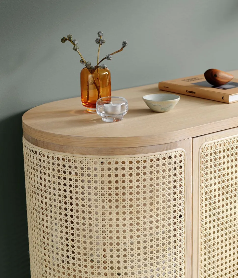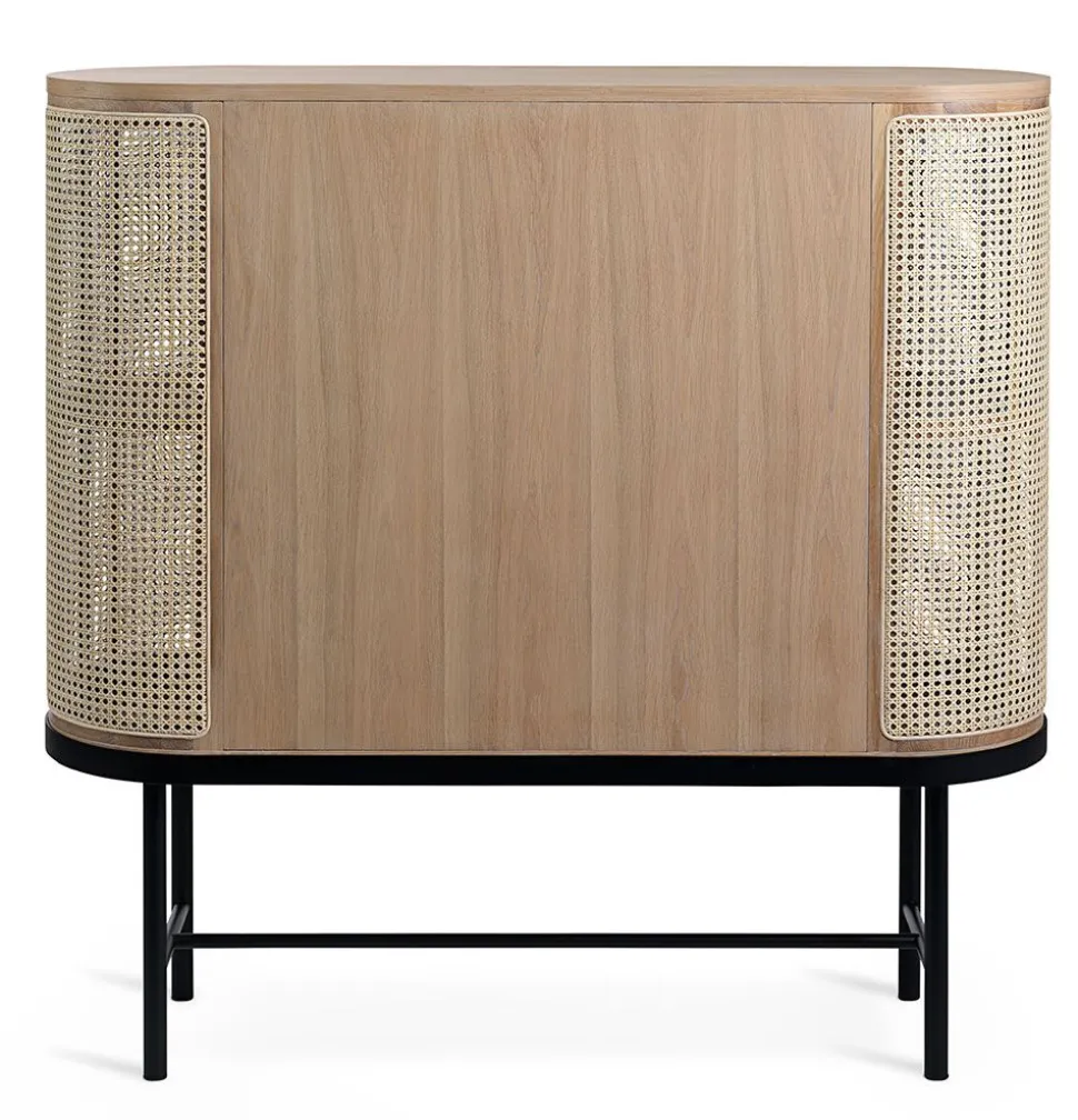 Die Serie „Be My Guest“, entworfen von der Dänin Charlotte Høncke, basiert auf einem schlichten nordischen Design, das mit abgerundeten Kanten und einem leicht eleganten Rahmen auf klassische Referenzen zurückgreift. Die Seiten des Barschranks sind aus französischem Rohrgeflecht mit einer Ablage aus Glas gefertigt und verströmen einen retro-modernen Stil, der perfekt für das nordische Zuhause ist. Der Schrank funktioniert perfekt für Geschirr im Wohnzimmer oder zur Aufbewahrung im Flur und Bad und ist gleichzeitig ästhetisch schön im Haus.