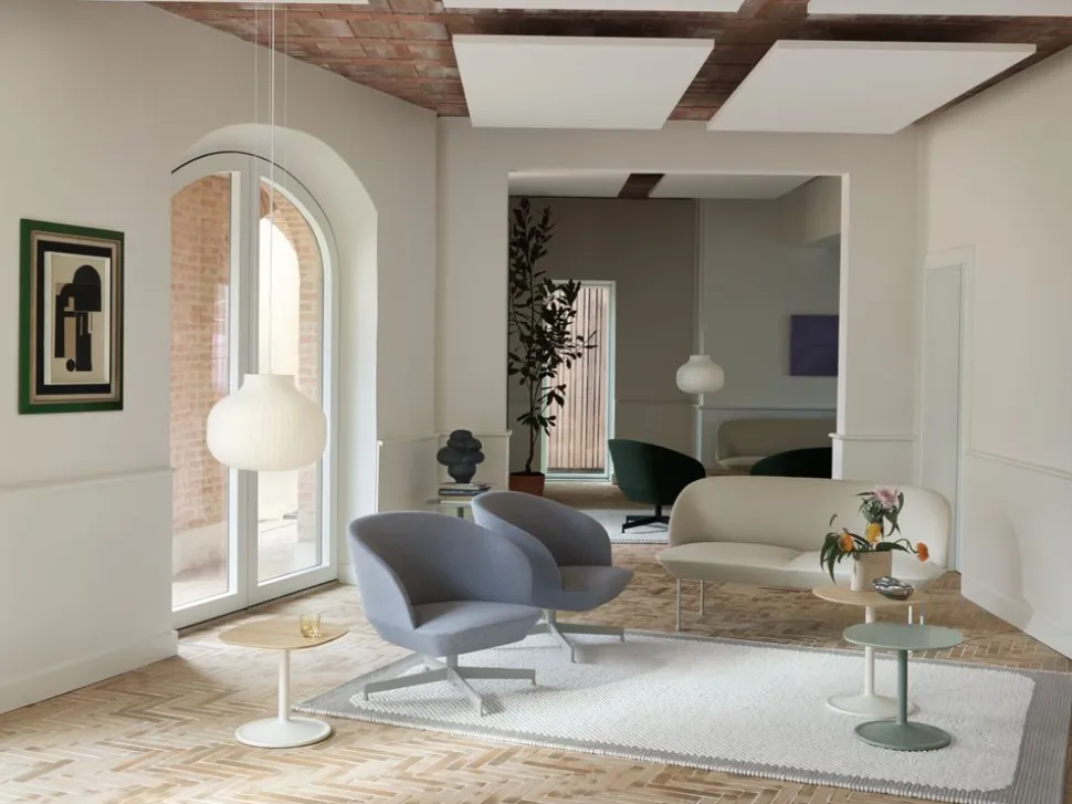 Die Strand Pendelleuchte von besticht durch ihre weiche und verspielte Form, die eine moderne Eleganz ausstrahlt. Diese einzigartige Leuchte bietet sowohl diffuses als auch direktes Licht, wobei letzteres durch die Öffnungen an der Ober- und Unterseite der Leuchte entsteht.