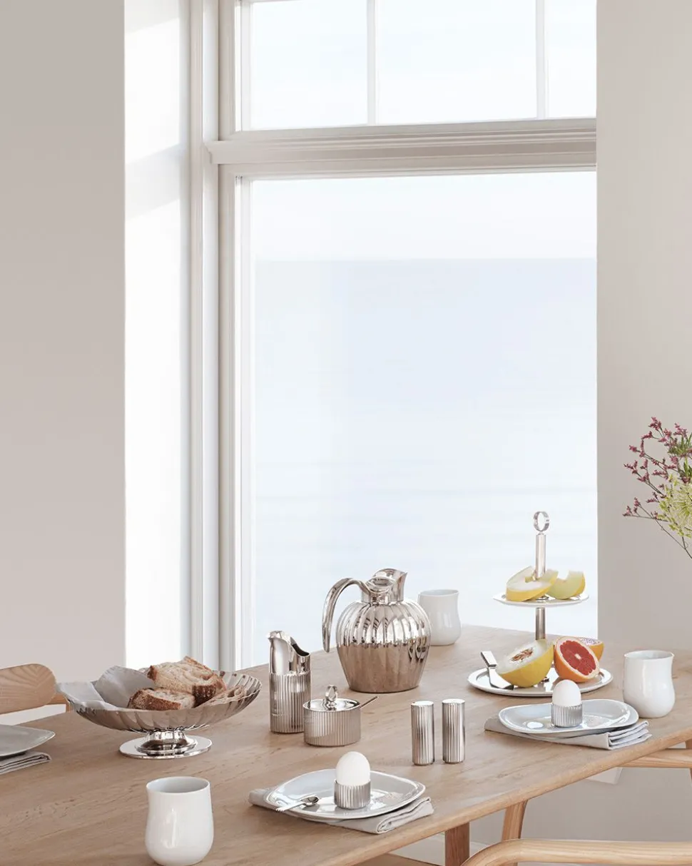 Der vom schwedischen Prinzen Sigvard Bernadotte entworfene Bernadotte-Sahnekrug von ist eine elegante Neuinterpretation eines ikonischen Designs von 1938. Dieser Krug ist aus Edelstahl gefertigt und von Hand poliert, wodurch eine spiegelähnliche Oberfläche entsteht, die das Licht wunderschön einfängt. Mit seinen vom Art déco inspirierten Rillen und seiner zeitlosen Form verkörpert er die Essenz skandinavischer Eleganz und Funktionalität.