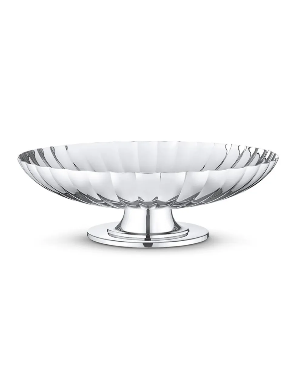 Der Bernadotte Dish On Stand von ist eine Hommage an die zeitlose Eleganz, die das ikonische Design von Sigvard Bernadotte auszeichnet. Die Schale besteht aus Edelstahl mit einer glaspolierten Oberfläche, die die charakteristischen geriffelten Linien wunderschön zur Geltung bringt, während der zierliche Sockel dezent auf Bernadottes klassische Kerzenständer verweist. Mit ihrem eleganten und luxuriösen Look ist diese Schale ein unverzichtbares Schmuckstück in der Sammlung eines jeden Designliebhabers.
