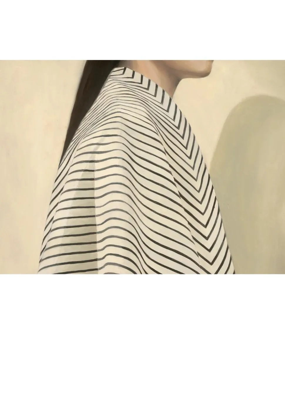 Product name: black stripes Brand name: paper collective Sinuous and flowing, Black Stripes by Swedish artist Jonna Valtner brings you into a world of understated elegance. Inspired by fleeting moments of desire created by classic films and contemporary photography, Valtner deliberately utilises cropping to create a sense of mystery within her compositions. Created by layers of oil paint on canvas, light and shadow further draw you in as the undulating fabric form alludes to a soft breeze floating by.