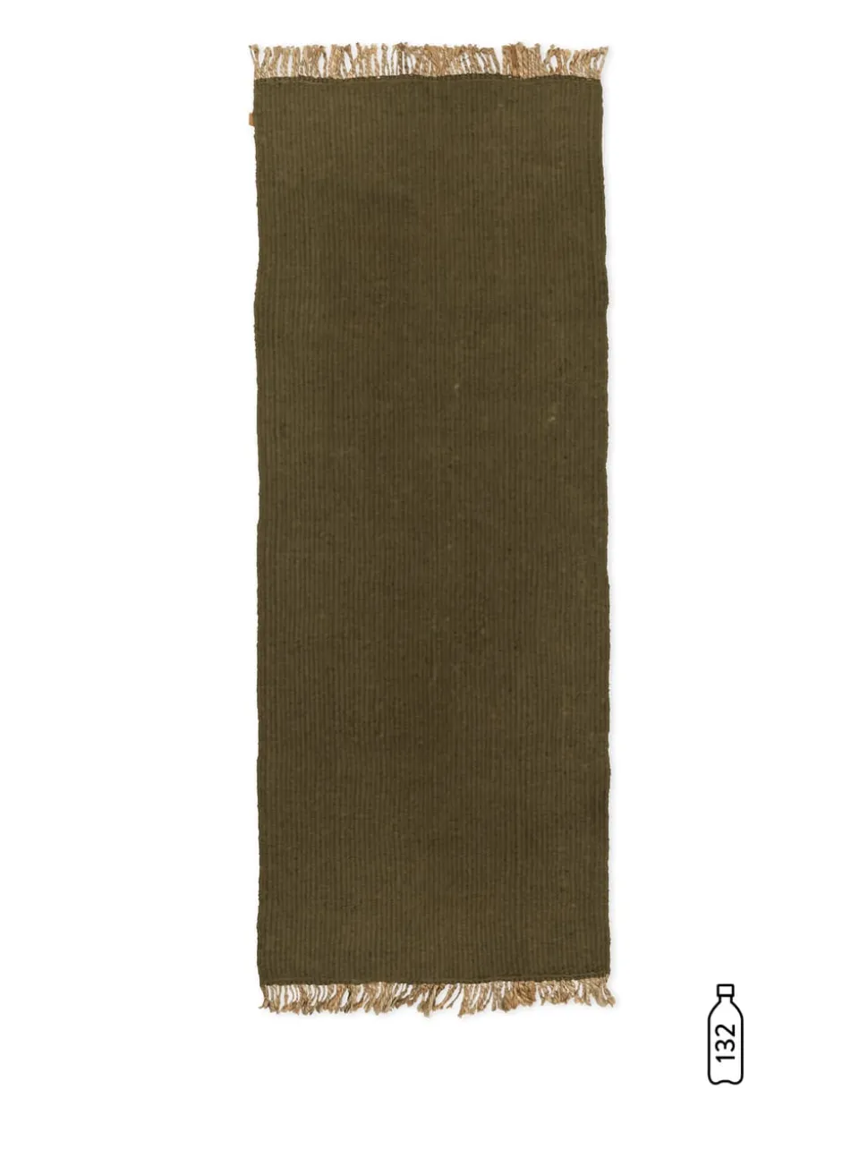 Schöner handgewebter Läufer aus einer Mischung aus natürlicher Jute und PET-Garn aus recyceltem Kunststoff. Seine längliche Form macht ihn ideal für den Flur oder einen schmalen Bereich, während die rohen Fransen ihm einen Hauch von rustikalem Charme verleihen.