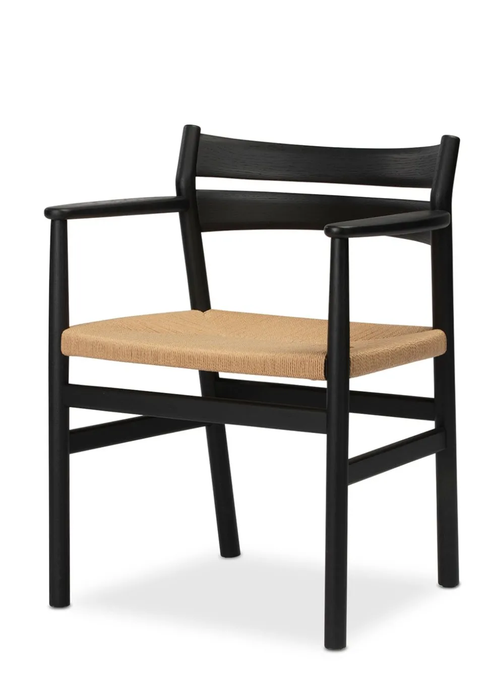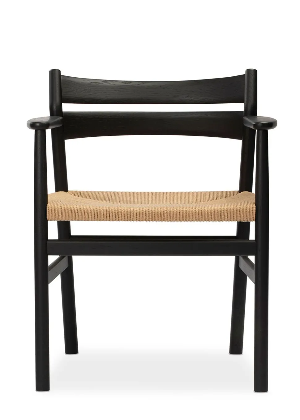 - Material: Massivholz in seifenbehandelter Eiche, geölter Eiche, schwarz lackierter Eiche oder geölter Räuchereiche mit schwarzem Furnier an der Armlehnenverbindung. Sitz aus naturfarbener oder schwarzer Papierkordel. Die Kordel ist mit Seife und Wachs behandelt, wodurch sie schmutzabweisend wird.
