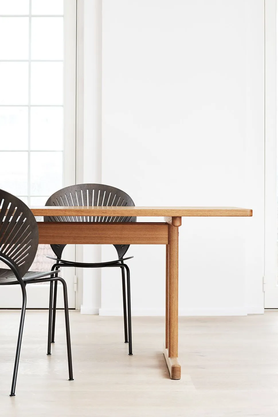 Der von Børge Mogensen 1964 entworfene Esstisch BM86″ gehörte zu Mogensens wachsendem Portfolio einzigartiger und funktionaler Tische, die im Laufe der Zeit sowohl national als auch international zu zeitlosen Klassikern wurden. Mogensens Tische waren alle stark von seiner Designphilosophie der Funktionalität der Möbel, der Transparenz der Konstruktion und der exquisiten Qualität guter Materialien geprägt. Die Tische wurden auch durch das „Form-follow-function“-Prinzip der Shaker-Bewegung und deren innovative Tischlermethoden beeinflusst. Sowohl Børge Mogensen selbst als auch sein Kollege gehörten zu den dänischen Designern, die dazu beitrugen, die Kluft zwischen dem Shaker-Design und dem skandinavischen Minimalismus zu überbrücken, weshalb Mogensens Tisch auch als „Shaker-Tisch“ bekannt ist.