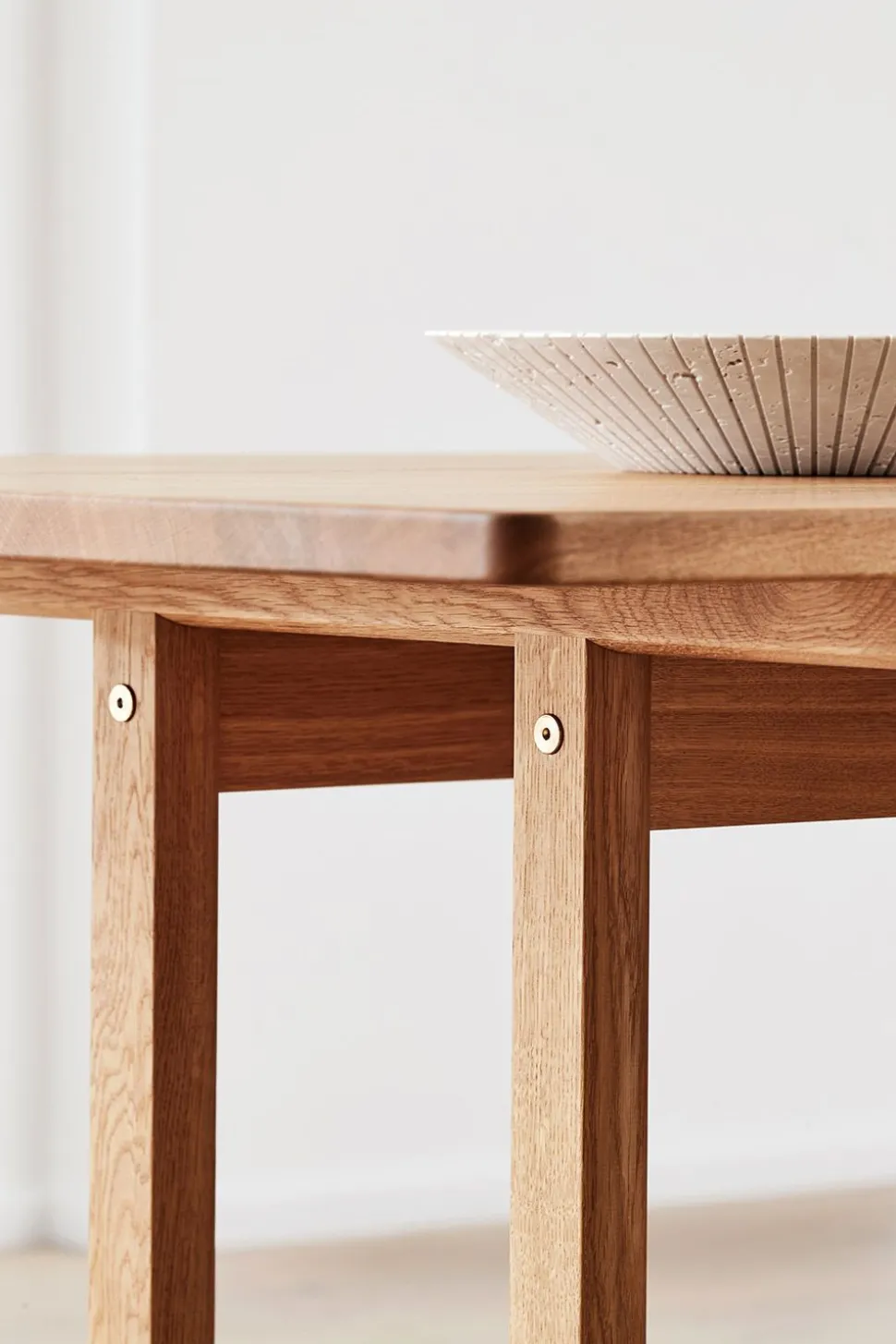 BM86″ ist für den Alltag und das Leben der Menschen konzipiert, was sich in der Konstruktion und im Design des Tisches deutlich widerspiegelt. Schlichte Linien prägen das Design, abgerundete Kanten sorgen für einen weichen Look. Das Gestell besteht aus zwei schlanken Tischbeinen, die am Ende in einem Fuß zusammenlaufen. Das ist nicht nur praktisch, weil es überflüssige Tischbeine vermeidet, sondern auch eine schöne Lösung, die optisch beeindruckt. Veredelungen wie Messingbeschläge und gefräste Bögen verleihen dem Tisch eine letzte Finesse, ohne das schlichte und nüchterne Design des Möbels zu übertönen.