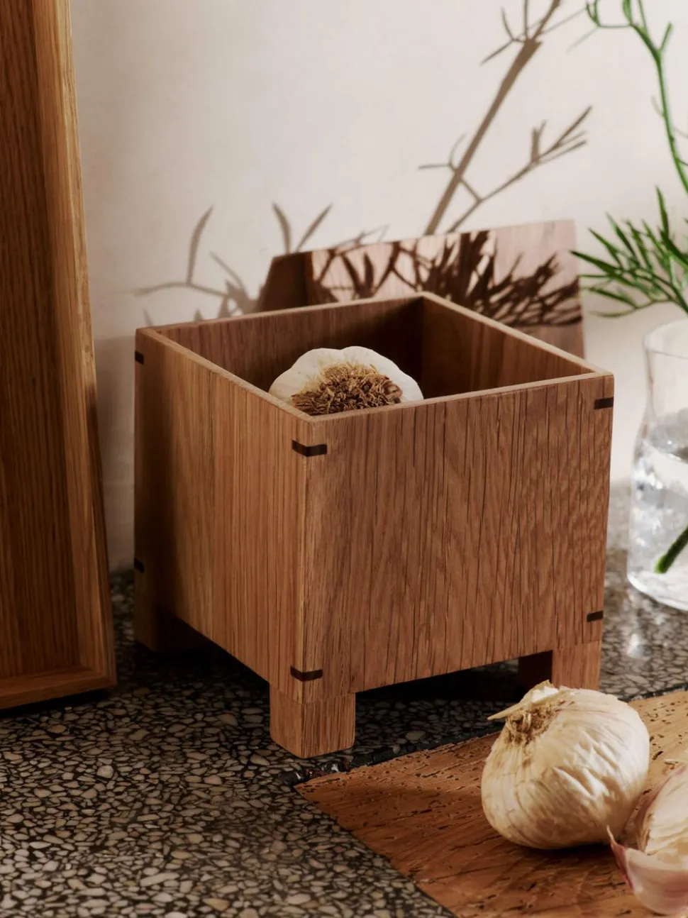 Sie eignet sich sowohl für offene Regale als auch für Küchentische, wo sie dem Dekor eine organische Wärme verleiht. Die Bon Garlic Box kann mit anderen Elementen aus der Bon-Kollektion kombiniert werden, um einen einheitlichen Look in der Küche zu erzielen. Die natürliche Holzstruktur verleiht ihr einen zeitlosen Look, der sowohl mit modernen als auch mit traditionellen Einrichtungen harmoniert. Kombinieren Sie sie mit Vorratsgläsern aus Keramik und Textilien in neutralen Tönen, um eine ausgewogene und einladende Küchenumgebung zu schaffen.