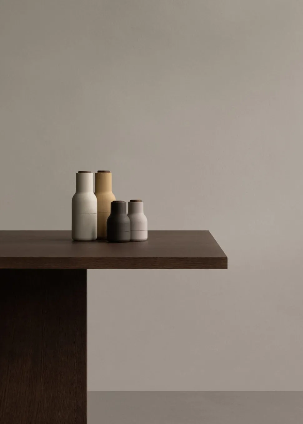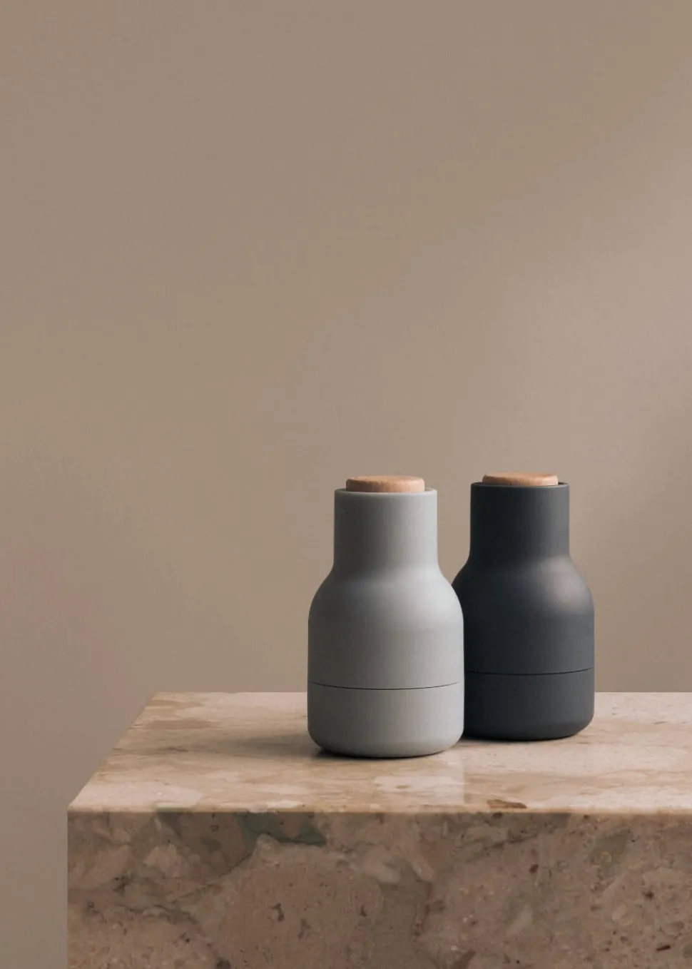 Die von Norm Architects entworfenen Bottle Grinders von sind eine gelungene Kombination aus skandinavischem Minimalismus und unübertroffener Funktionalität. Die kleinen Grinder im Zweier-Set bestehen aus robustem Kunststoff mit einer seidenweichen Silikonbeschichtung, einem Keramikmahlwerk und einem eleganten Holzdeckel aus Buche oder Walnuss. Mit ihrer schlanken Flaschenform liegen sie gut in der Hand und verleihen jedem Esstisch oder jeder Küche einen Hauch von Raffinesse.