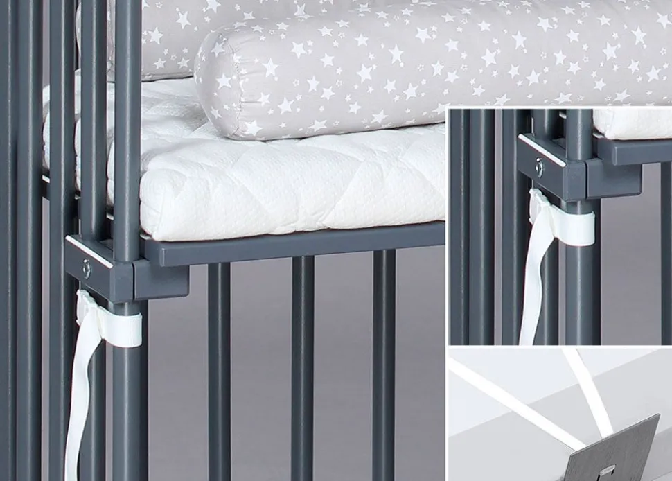 Boxspring Co-Sleeper von kombiniert Funktionalität und Komfort in einem alternativen Babybett. Das Boxspring-Modell ist größer als der ursprüngliche Co-Sleeper, was z.B. für Zwillinge ideal ist. Das Beistellbettchen ermöglicht es, Ihr Baby zur Schlafenszeit in Ihrer Nähe zu haben. Durch die einzigartige Höhenverstellung des Bettchens werden Lücken zwischen Ihnen und Ihrem Baby vermieden. Das Boxspring-Bettchen verfügt über eine spezielle Gurtbefestigung und lässt sich daher schnell und einfach am Elternbett befestigen. Die Höhenverstellung ermöglicht es, die Höhe des Kinderbettes genau an das Bett der Eltern anzupassen.