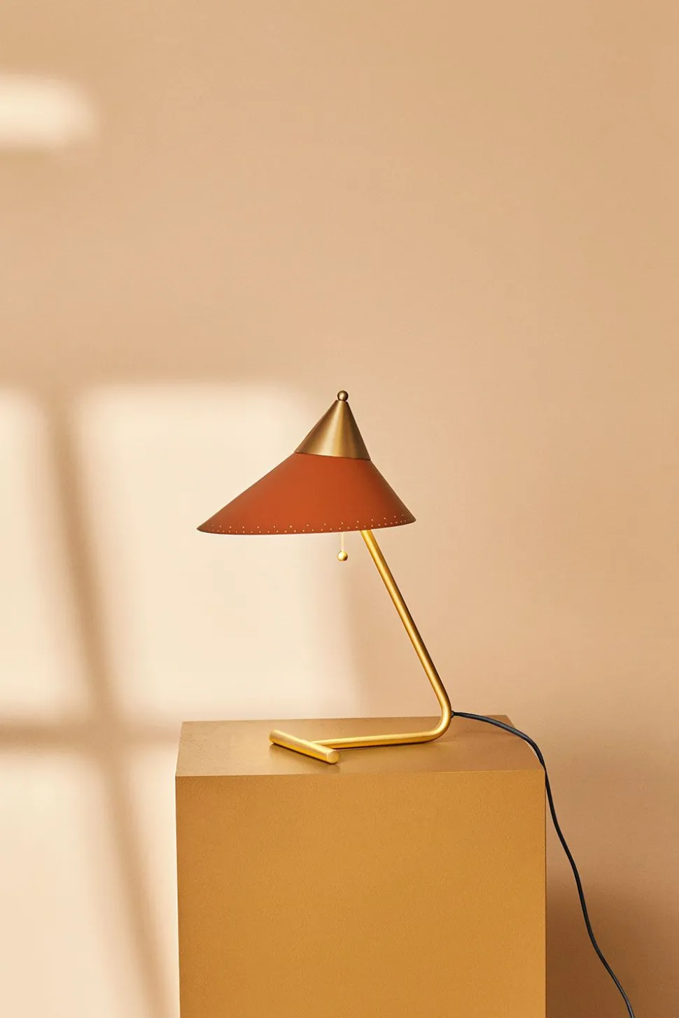 Die Leuchte „Brass Top“, entworfen vom Dänen Svend Aage Holm-Sørensen, ist zugleich ein Paradebeispiel für die modernistischen Trends der 1950er Jahre und Holm-Sørensens einzigartiges Gespür dafür, Licht in figurativen Designs einzufangen. Der breite, skulpturale Schirm mit exklusiven Messingdetails spendet ein weiches Licht und ruht auf einem eleganten Messingsockel, die zusammen ein asymmetrisches Meisterwerk mit attraktivem Licht ergeben. Als einzigartiges Detail, das dem Stil der 50er Jahre entspricht, wird die Leuchte über einen traditionellen Zuglichtschalter eingeschaltet, der der Leuchte den letzten Schliff verleiht.