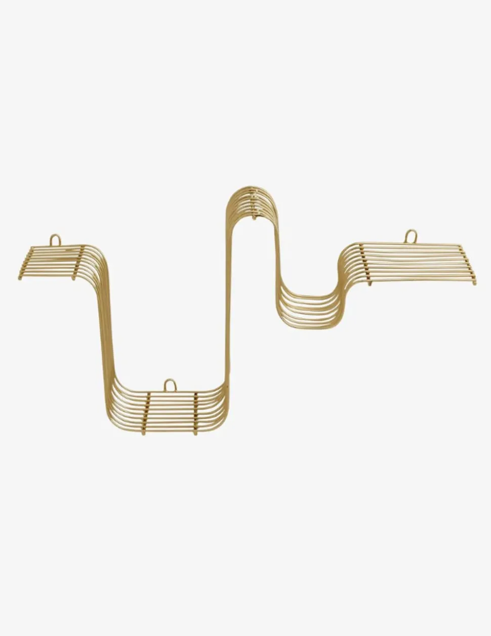 Das perfekte Regal mit schönem Design zur Aufbewahrung von kleinen Gegenständen. Das Regal ist messingfarben lackiert und verleiht dem gesamten Regal einen einzigartigen Look. Das Regal hat auf der Rückseite drei Löcher zum Aufhängen. Dekorieren Sie Ihr Zuhause mit dem Regal und lassen Sie Ihre Lieblingssachen hervorstechen und dekorieren. Das Regal hat ein wunderschönes Design mit seinen geschwungenen Formen, die Ihrem Zuhause einen einzigartigen Raum verleihen, je nachdem, in welchem Zimmer Sie es aufstellen möchten. Schrauben zum Aufhängen sind im Lieferumfang enthalten.