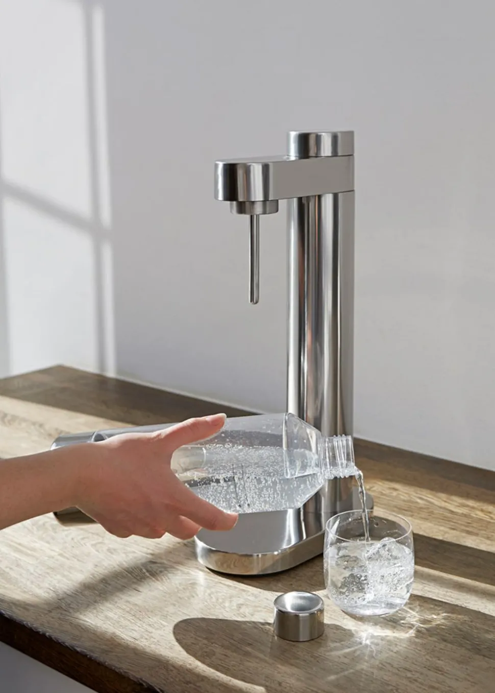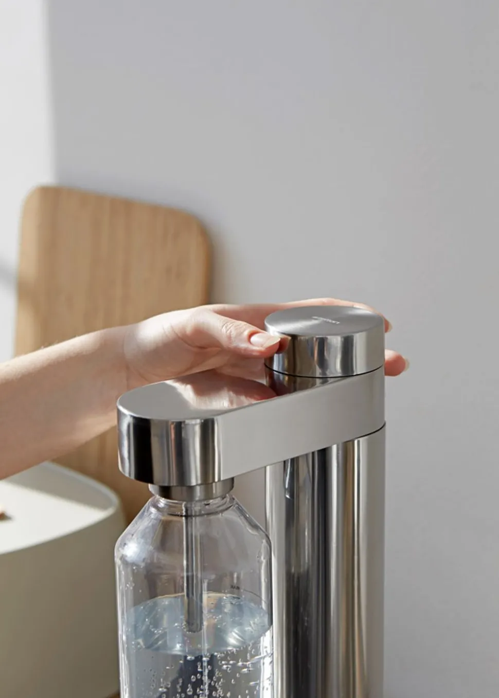 Der Brus Carbonator ist unglaublich praktisch, und wenn Sie Ihr eigenes kohlensäurehaltiges Wasser oder Erfrischungsgetränke herstellen, verbrauchen Sie weniger unnötiges Plastik. Das Design weist mehrere zylindrische Formen auf, die charakteristisch für Steltons Design sind. Der Karbonisierer hat ein unglaublich elegantes Design, das ihn zu einem echten Hingucker auf dem Küchentisch macht.