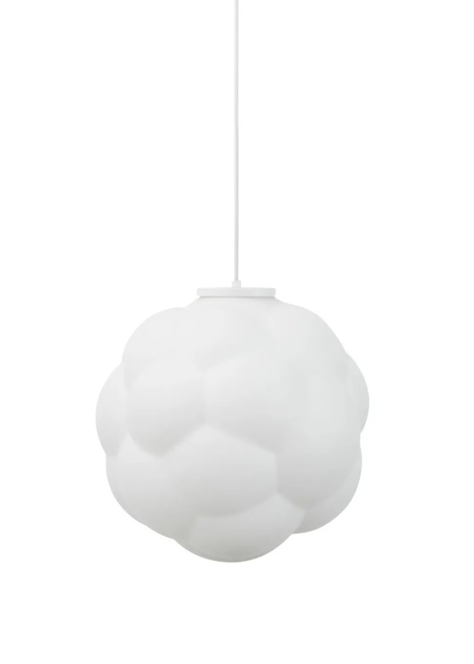 Die Pendelleuchte wird mit einem 4 Meter langen Textilkabel und einem weißen Kunststoffschirm geliefert. Externes Stromkabel und Leuchtmittel sind nicht enthalten. Bubba ist eine Kollektion charaktervoller Leuchten, die von den vielgestaltigen Clustern schwebender Seifenblasen inspiriert sind.