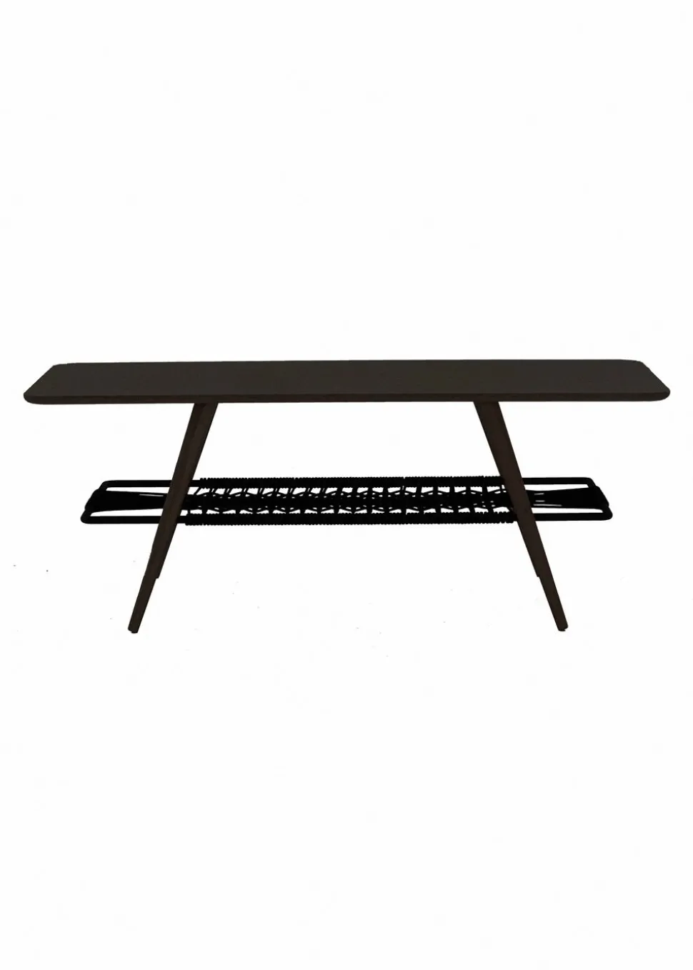 Couchtisch C7 von in hochwertiger moderner Eiche. Das Design des Tisches ist von alten Retro-Teakholztischen inspiriert, bei denen sich das stromlinienförmige Design und der Kontrast zwischen dem Holz und dem darunter liegenden Regal aus Korbgeflecht wiederholt. Das dunkle Regal aus Korbgeflecht eignet sich perfekt zur Aufbewahrung von Zeitschriften und Alltagsgegenständen.