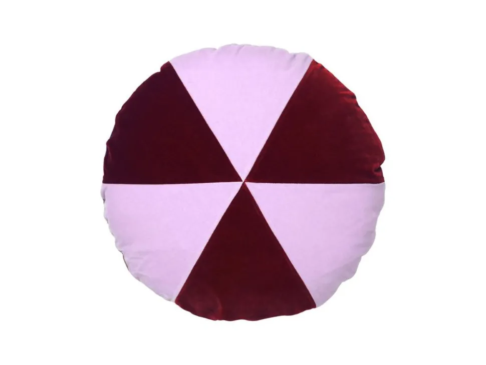 Das Kissen ist auf der Rückseite einfarbig und auf der Vorderseite gemustert, so dass ein tortenähnliches Muster entsteht. Die runde Form des Kissens ist symmetrisch in dreieckige Felder unterteilt, die jeweils eine eigene Farbe haben.