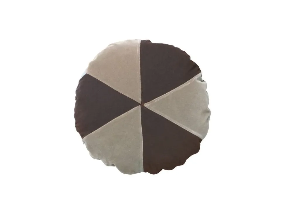 Das Kissen ist auf der Rückseite einfarbig und auf der Vorderseite gemustert, so dass ein tortenähnliches Muster entsteht. Die runde Form des Kissens ist symmetrisch in dreieckige Felder unterteilt, die jeweils eine eigene Farbe haben.