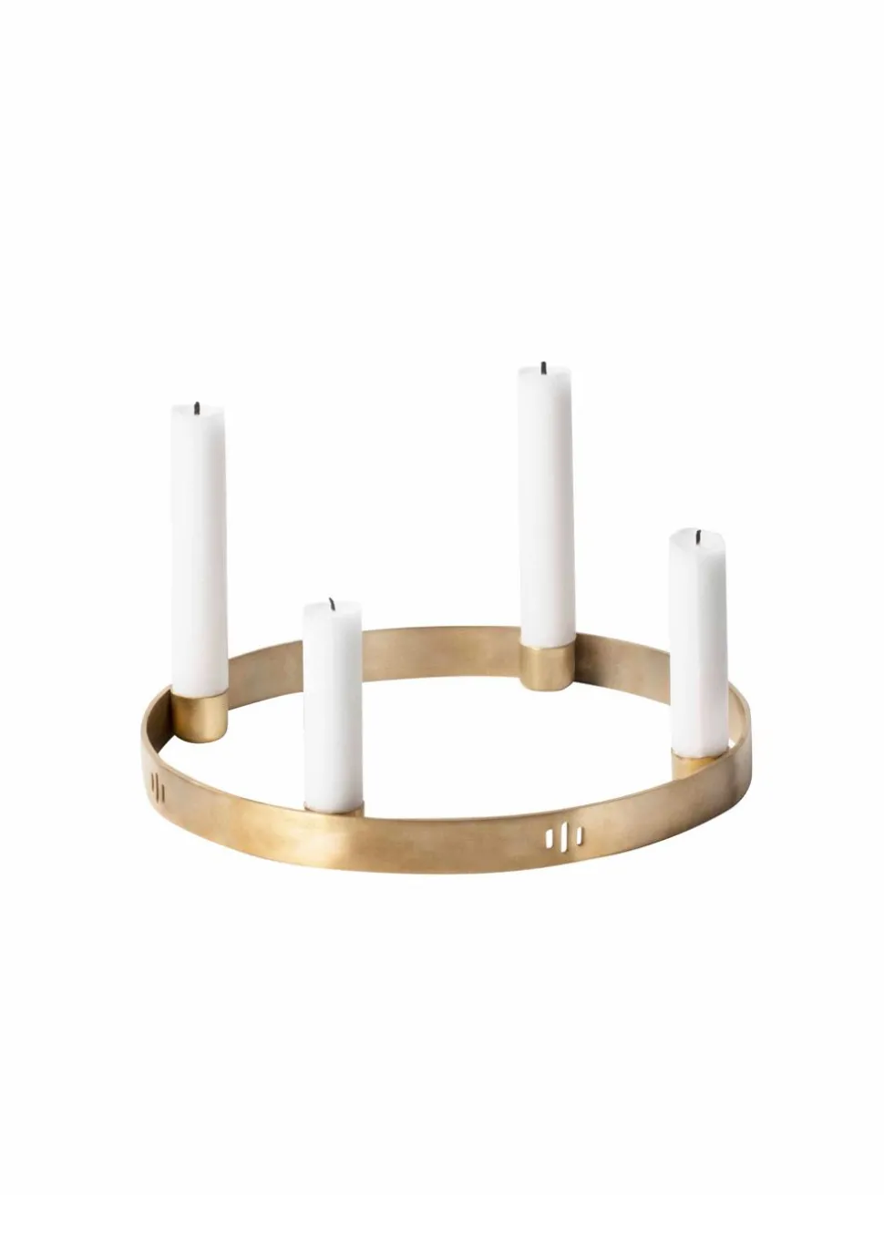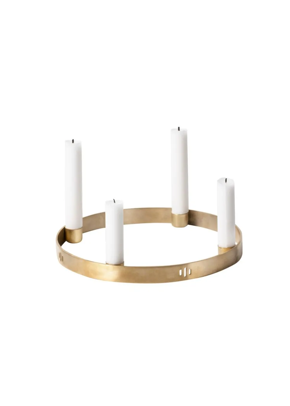 Ein schöner Kerzenhalter in zwei Größen aus Messing. Der Kerzenhalter ist vielseitig einsetzbar und hat einen minimalistischen Ausdruck in Form und Material. Die natürlichen Materialien sehen entweder auf dem Tisch oder wenn Sie das große Modell wählen, sehen sie wunderschön aus, wenn sie von der Decke in den abnehmbaren Lederbändern hängen.