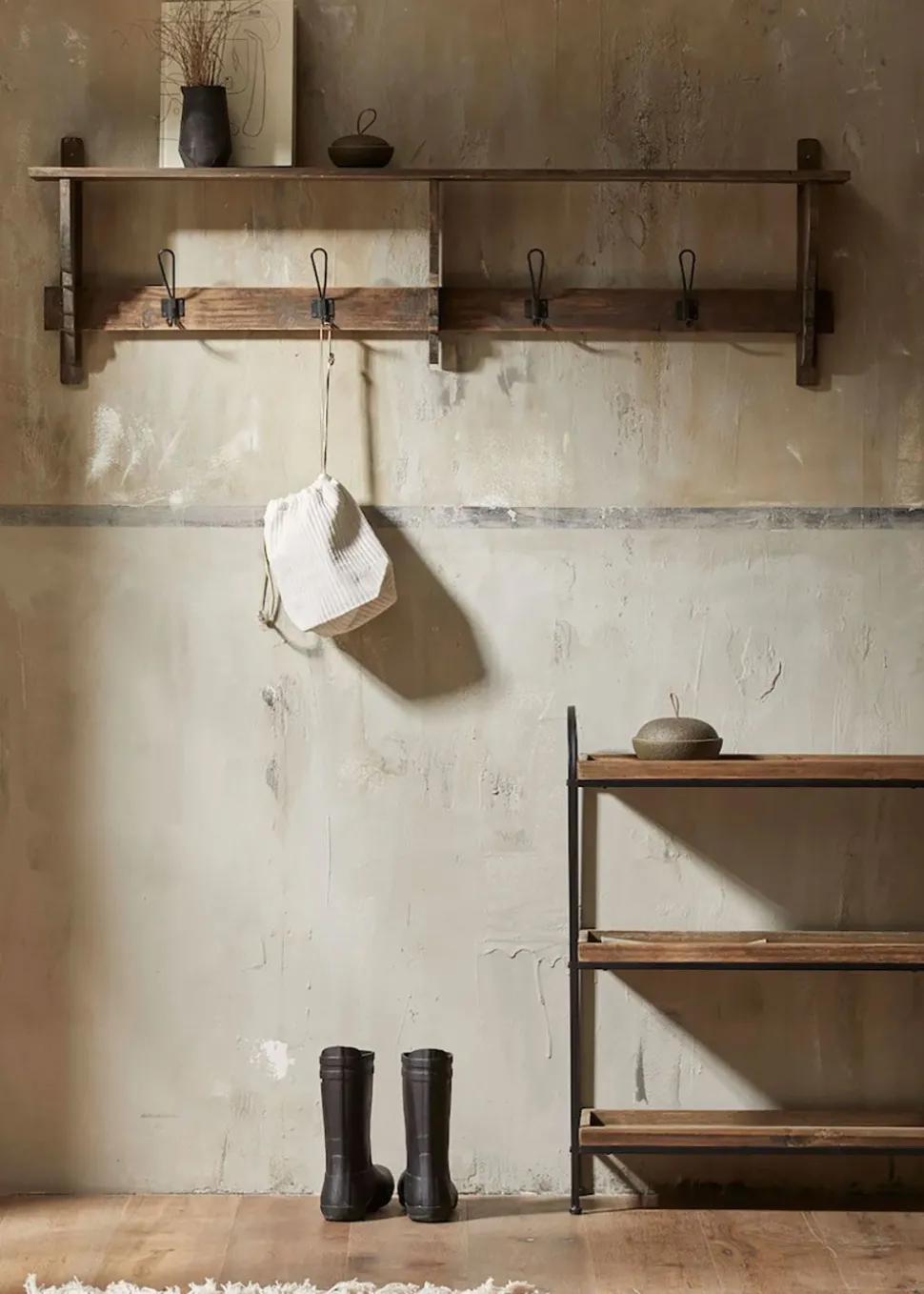 Verstauen Sie Ihre Taschen und Jacken auf dem CARONU-Regal und genießen Sie den inspirierenden und kreativen Touch, den es in Ihr Zuhause bringt. Es schafft eine schöne und organische Erfahrung, die Funktionalität und Ästhetik auf elegante Weise miteinander verbindet.