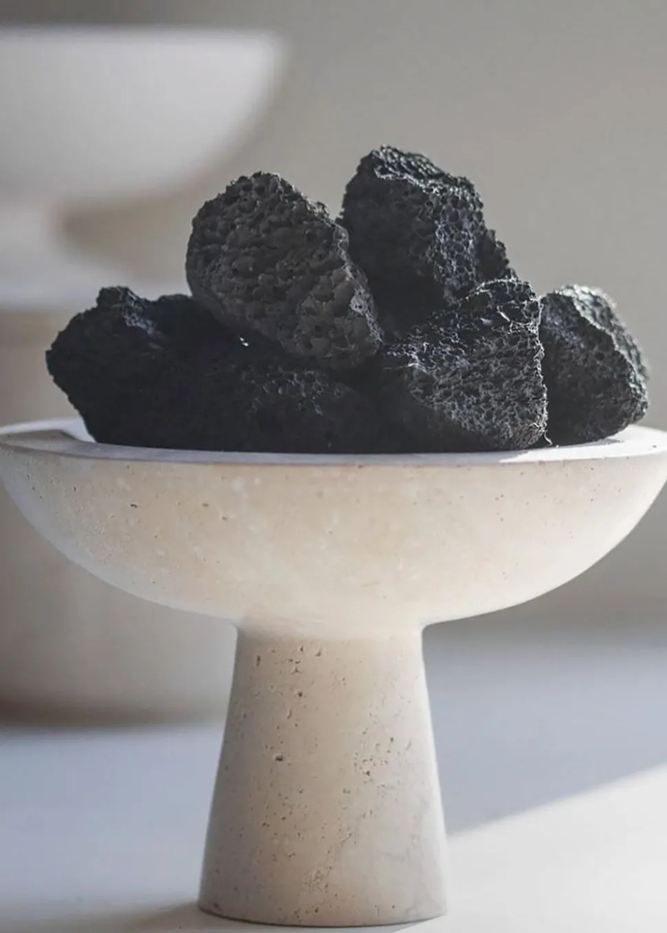 Der Travertin-Diffusor Centrepiece von ist eine elegante und funktionale Ergänzung für Ihr Zuhause. Dieses wunderschöne Mittelstück ist aus natürlichem Travertin geschnitten und wird mit einzigartigen, natürlich geformten Lavasteinen geliefert, die perfekt in die Vertiefung der Schale passen.