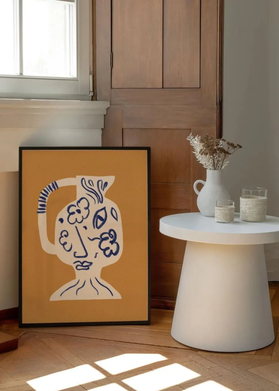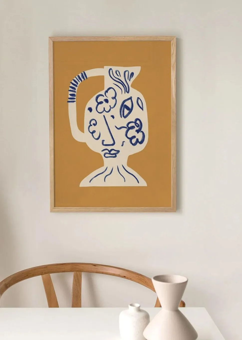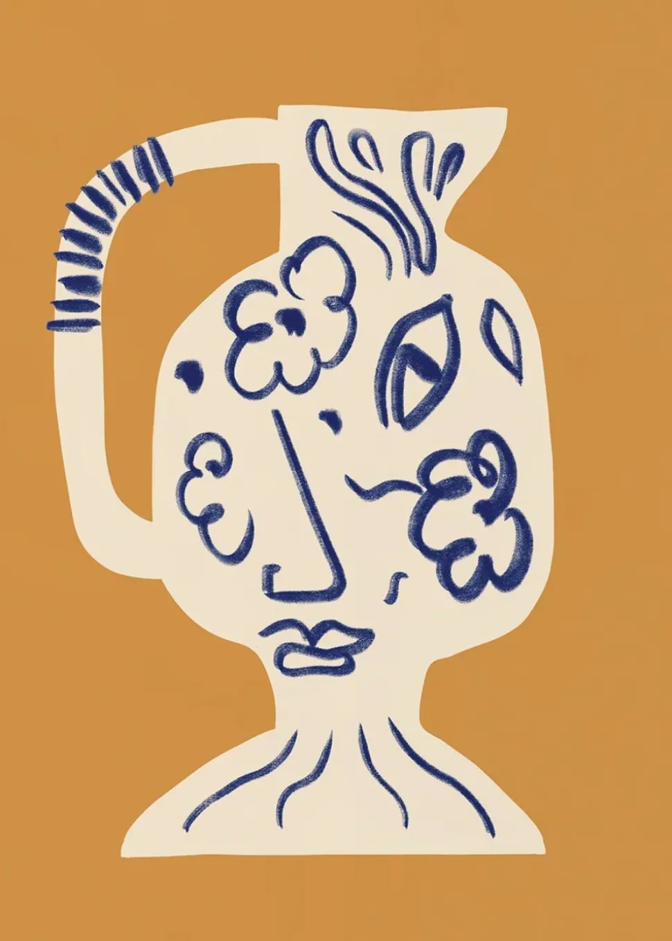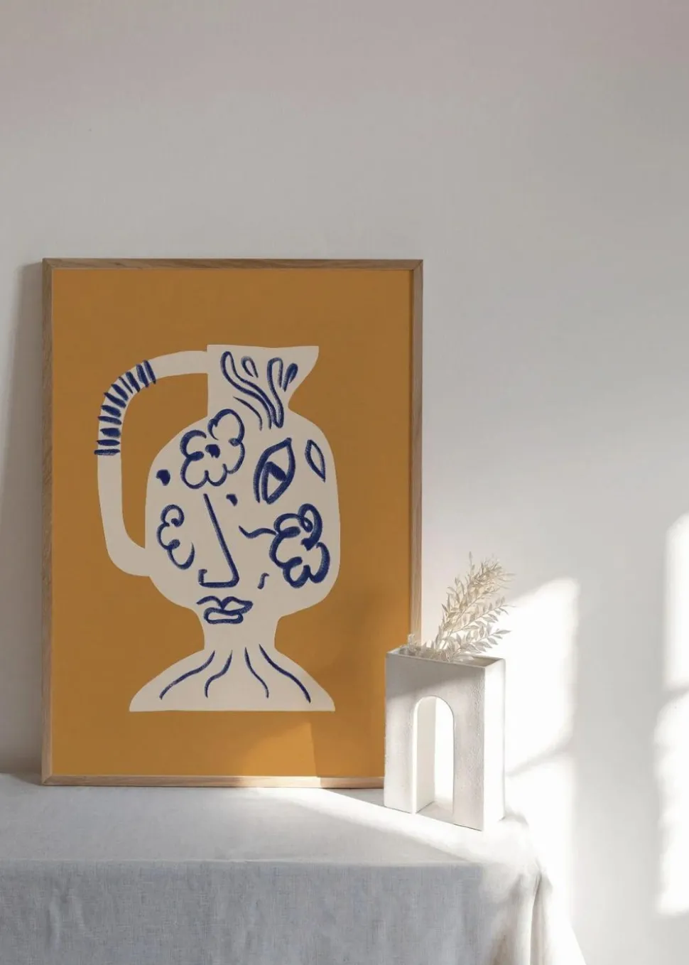 Der von der Künstlerin Renske Herder entworfene Keramikkrug ocre ist ein schönes Poster. Sein Motiv soll einen einzigartigen Krug mit schönen Formen und Farben darstellen. Der Krug wird in einer einfachen und stilvollen Anordnung auf einem gelb-braunen Hintergrund gezeigt, der den tiefen dunkelblauen Farbton hervorhebt.