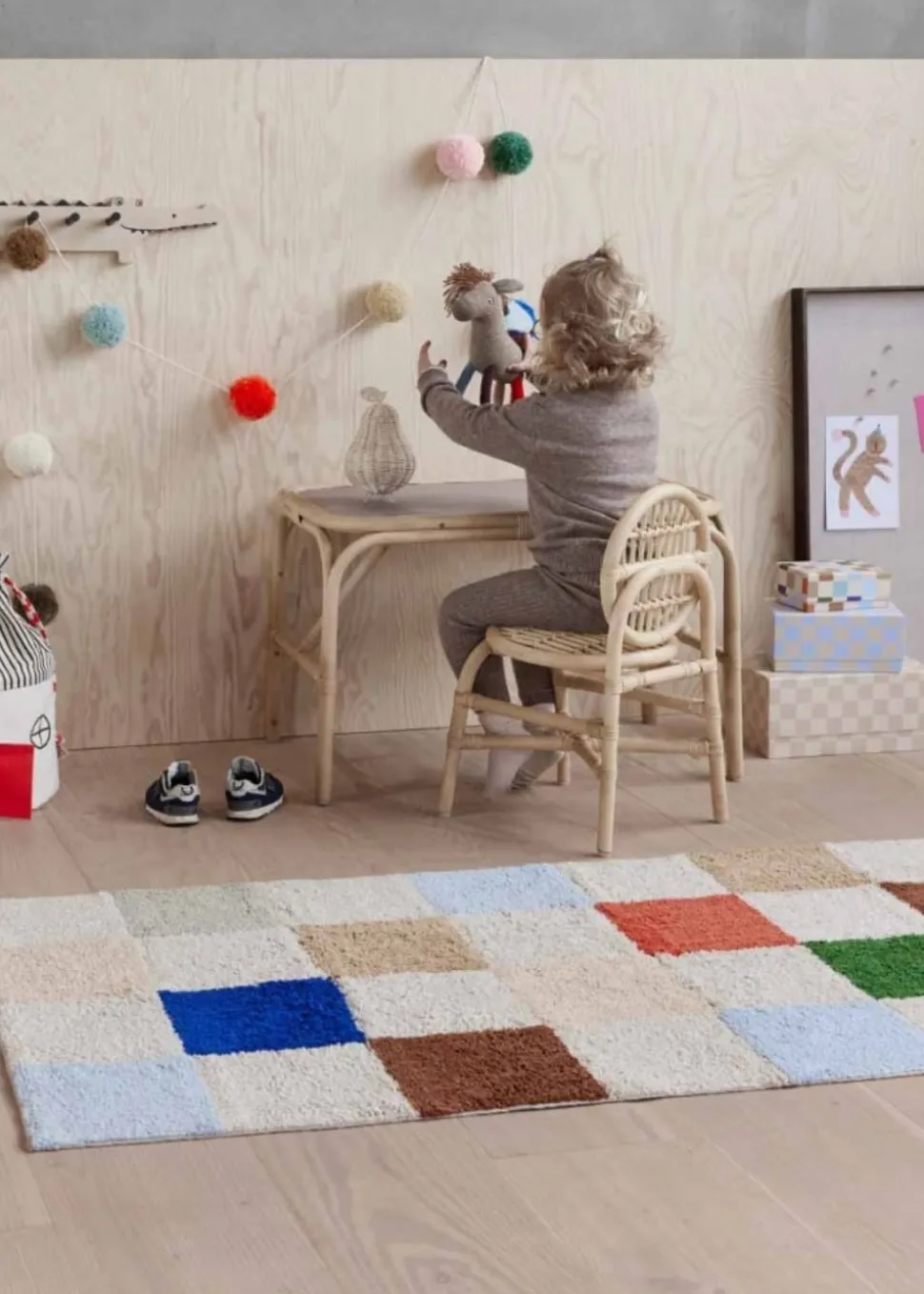 Mit seinem Schachbrettmuster lädt der Teppich zu Spaß und Fantasie ein, ob als weiche Unterlage für Konstruktionsspiele oder als bunte Unterlage für gemütliche Momente. Legen Sie ihn in die Mitte des Zimmers, um einen zentralen Spielbereich zu schaffen, oder kombinieren Sie ihn mit anderen OYOY-Produkten, um eine harmonische und inspirierende Einrichtung zu schaffen, in der Groß und Klein spielen und lernen können.